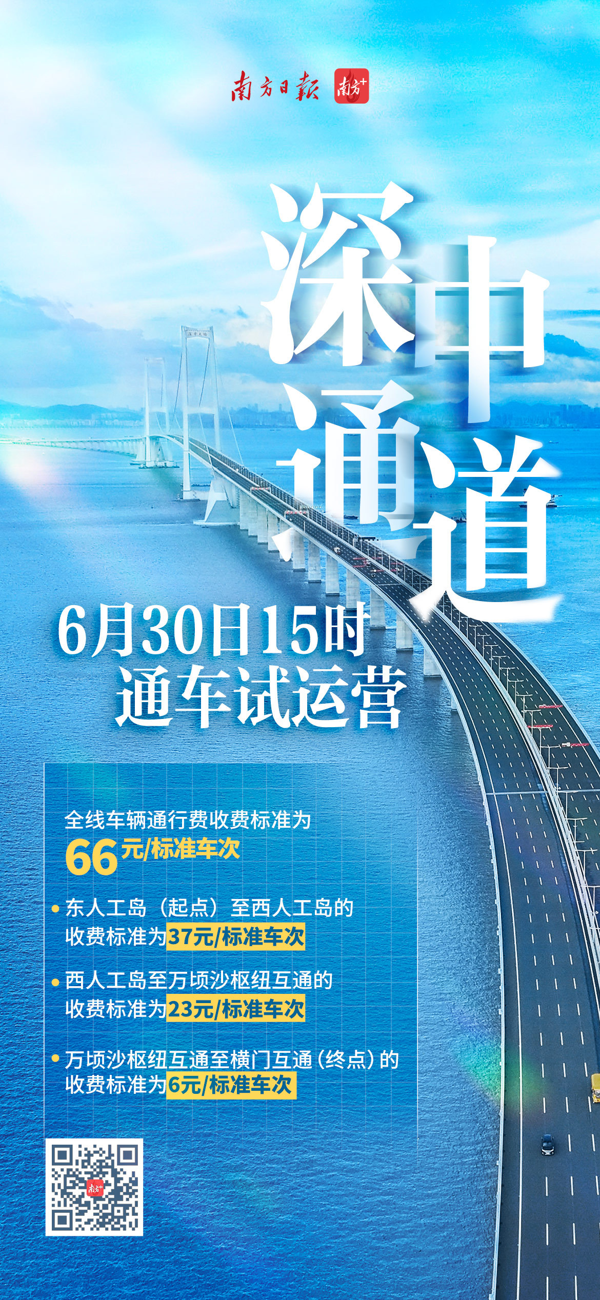 6月27日上午,深中通道管理中心召开的媒体通气会透露,深中通道预计6月30日正式开通,上午举行通车活动,下午3时通车试运营。届时,深圳与中山之间的通行时间将从2小时缩短至半小时内。