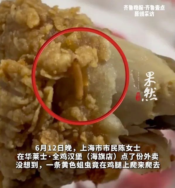 6月12日晚,上海网友陈女士在社交媒体发布视频称,她所购买的华莱士炸鸡腿中,竟然爬出了一条活的蛆虫。陈女士表示:“当时我整个人都不好了,要恶心死了!”