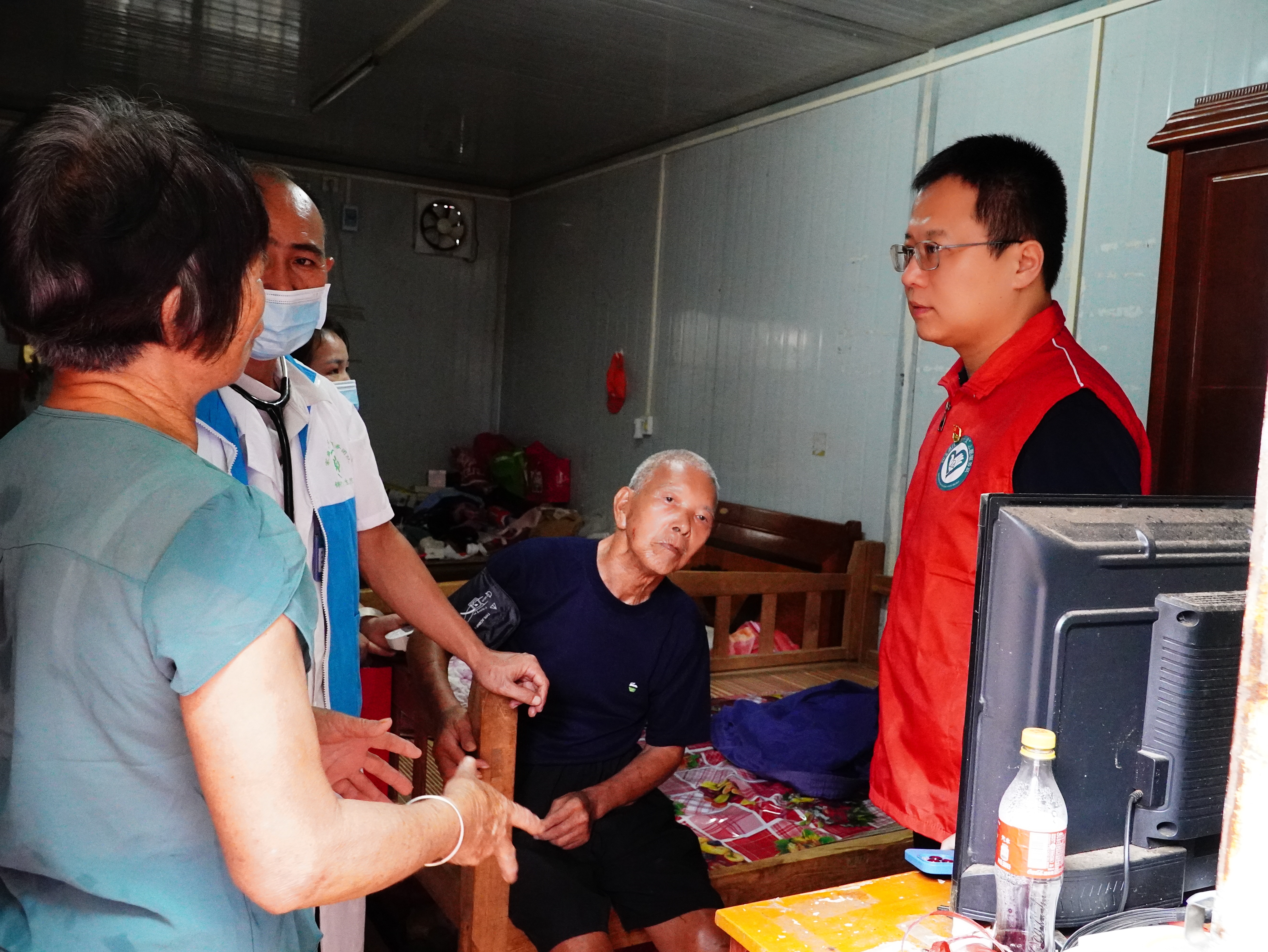 在入户走访的途中,天空骤然暗沉,豆大的雨点毫无征兆地砸在菠萝地里,瞬间织成一张密密的雨网。蔡医生和志愿者小张深一脚浅一脚地踩在泥泞的村道上,鞋子早已沾满泥浆。今天要走访的最后一户是低保户王奶奶家,大家依旧顶着风雨加快了脚步。王奶奶拄着拐杖,颤巍巍地挪动脚步,把大家往屋里让。小张将带来的大米和食用油轻轻放在凳子旁。“奶奶,我们赶紧测一下您的血压,看有没有变化。”蔡医生的动作依旧娴熟而专注,他仔细地为老人测量血压、听诊心肺。检查完毕后,小张从背包中取出一份图文并茂的健康手册,用通俗易懂的语言向王奶奶讲解日常保健知识,还特意叮嘱她雨天路滑,尽量减少外出,务必小心摔倒。临别时,王奶奶执意杵着拐杖送他们到门口,眼里充满了温暖的期盼。