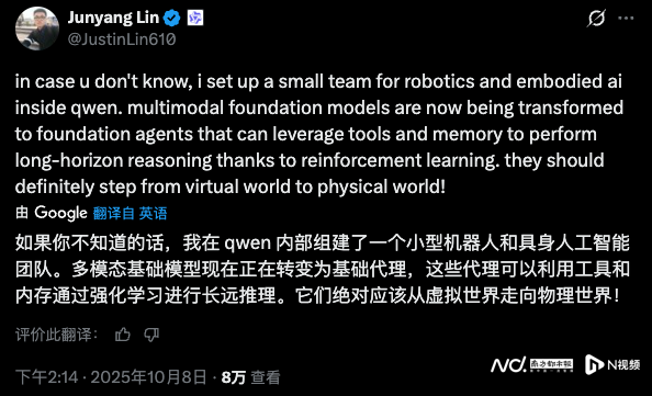 林俊旸为通义千问的技术负责人,他发帖表示,多模态模型正被转化为能够执行长时序推理任务的基础智能体,这些应用“理应从虚拟世界迈向现实世界!”