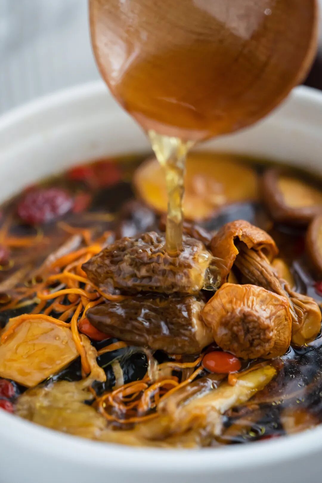 还有形似牡丹而非牡丹的灰树花,灰色的三叶草叶片加上清香四溢的口感,是煲汤的不二选择。“真菌皇后”金耳,金灿灿外表,果冻般的质感,丰富营养的内涵,遇热即出胶,散发的胶质可促进皮肤弹性。