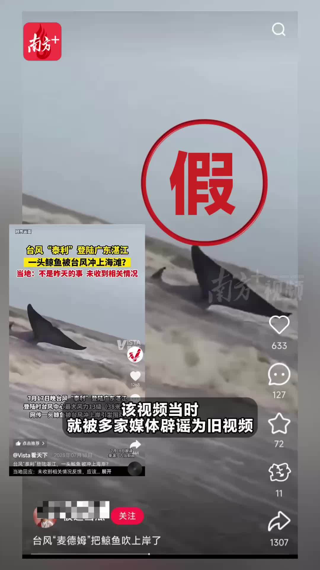 南方+记者检索发现,该视频早在2023年台风“泰利”登陆湛江时就已出现。当时,该视频称:台风“泰利”导致鲸鱼被冲上岸,引发大量关注,当即被多家媒体辟谣为旧视频。徐闻县相关部门也表示,未收到相关情况报告。