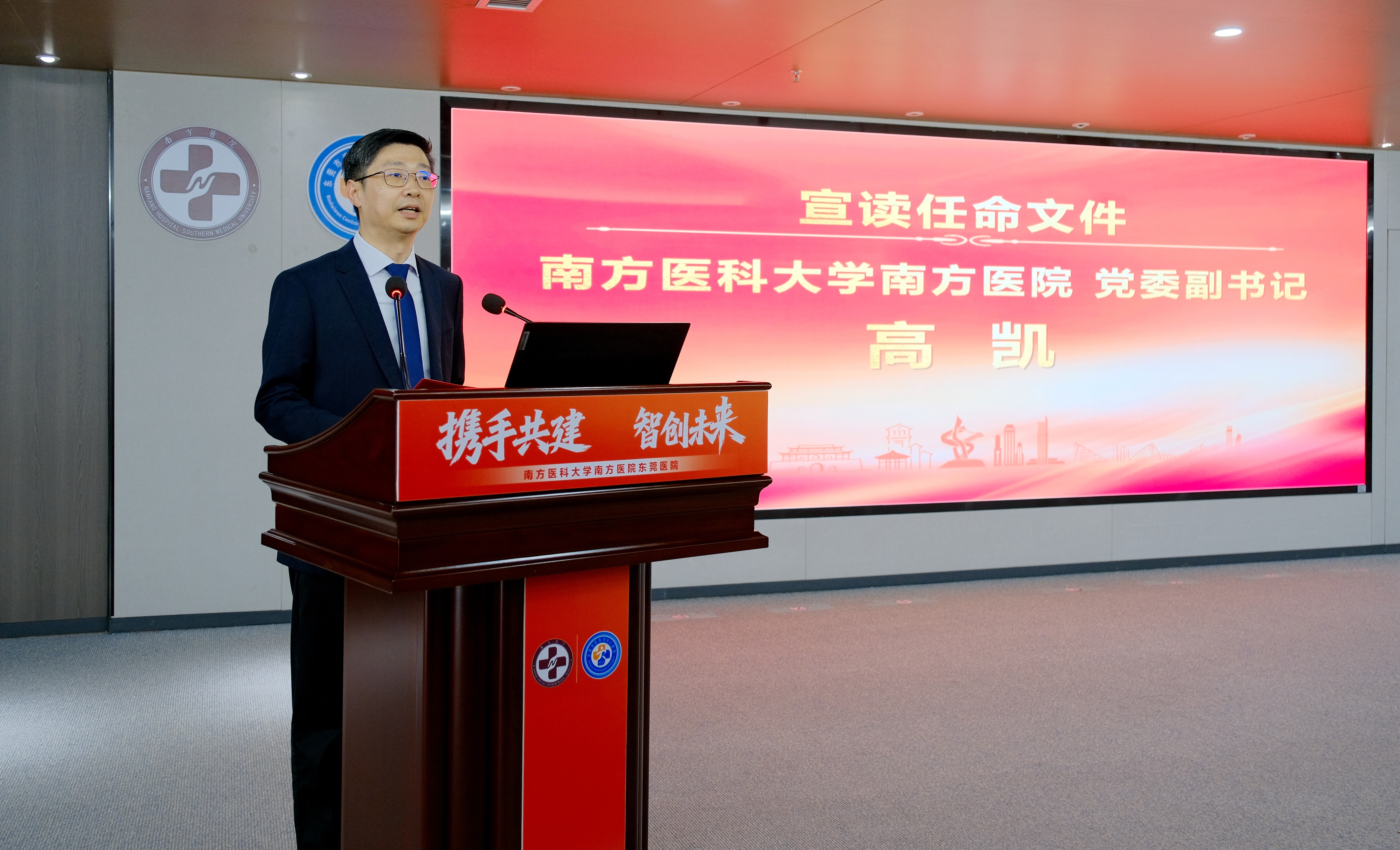 大会上,南方医科大学南方医院高凯副书记宣读任职文件,任命郑浩轩为南方医科大学南方医院东莞医院(东莞市滨海湾中心医院)党委副书记、院长。