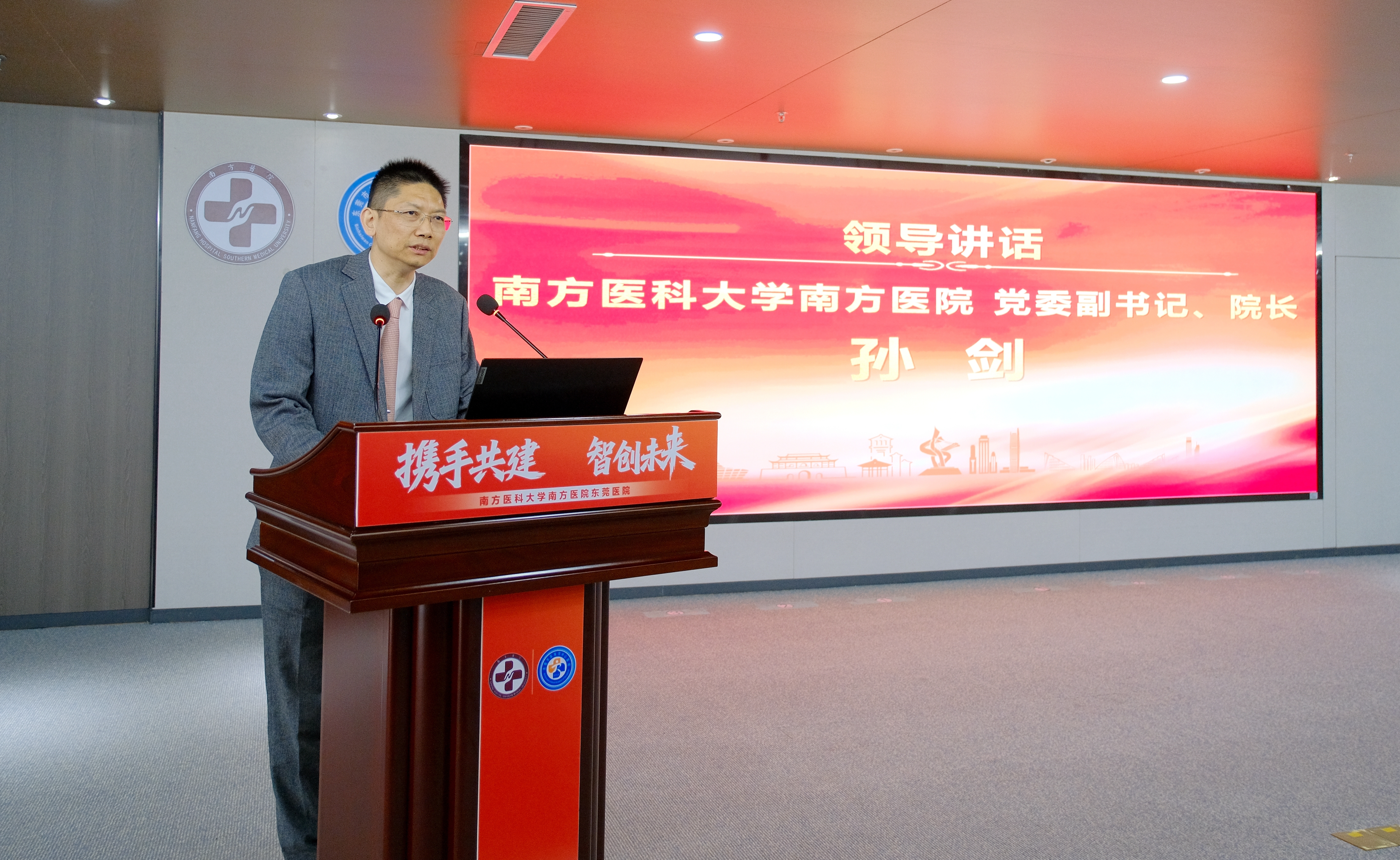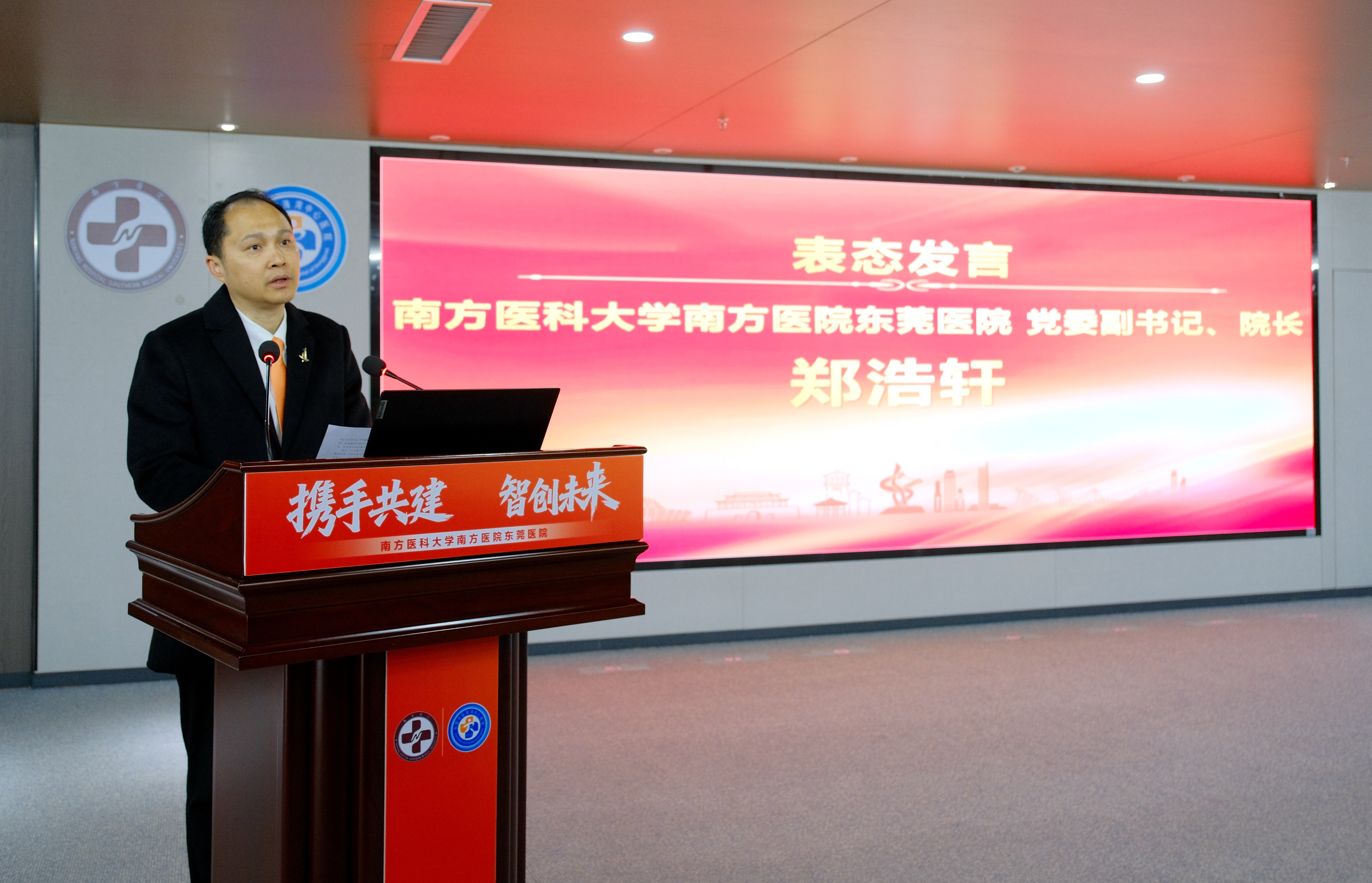 南方医科大学南方医院院长孙剑强调了此次合作共建的重要意义,介绍南方医院的核心优势,表示医院将切实履行托管职责,在管理、学科、人才等方面提供系统性支持,推动优质资源高效下沉。他希望,郑浩轩院长尽快融入新集体、真抓实干,团结带领全院职工实现医院新跨越,相信在各方共同努力下,构建互利共赢的协同发展格局,将东莞医院建设成为政府放心、群众满意、员工自豪、特色鲜明的区域医疗中心,为“健康东莞”“健康广东”建设贡献更大力量。