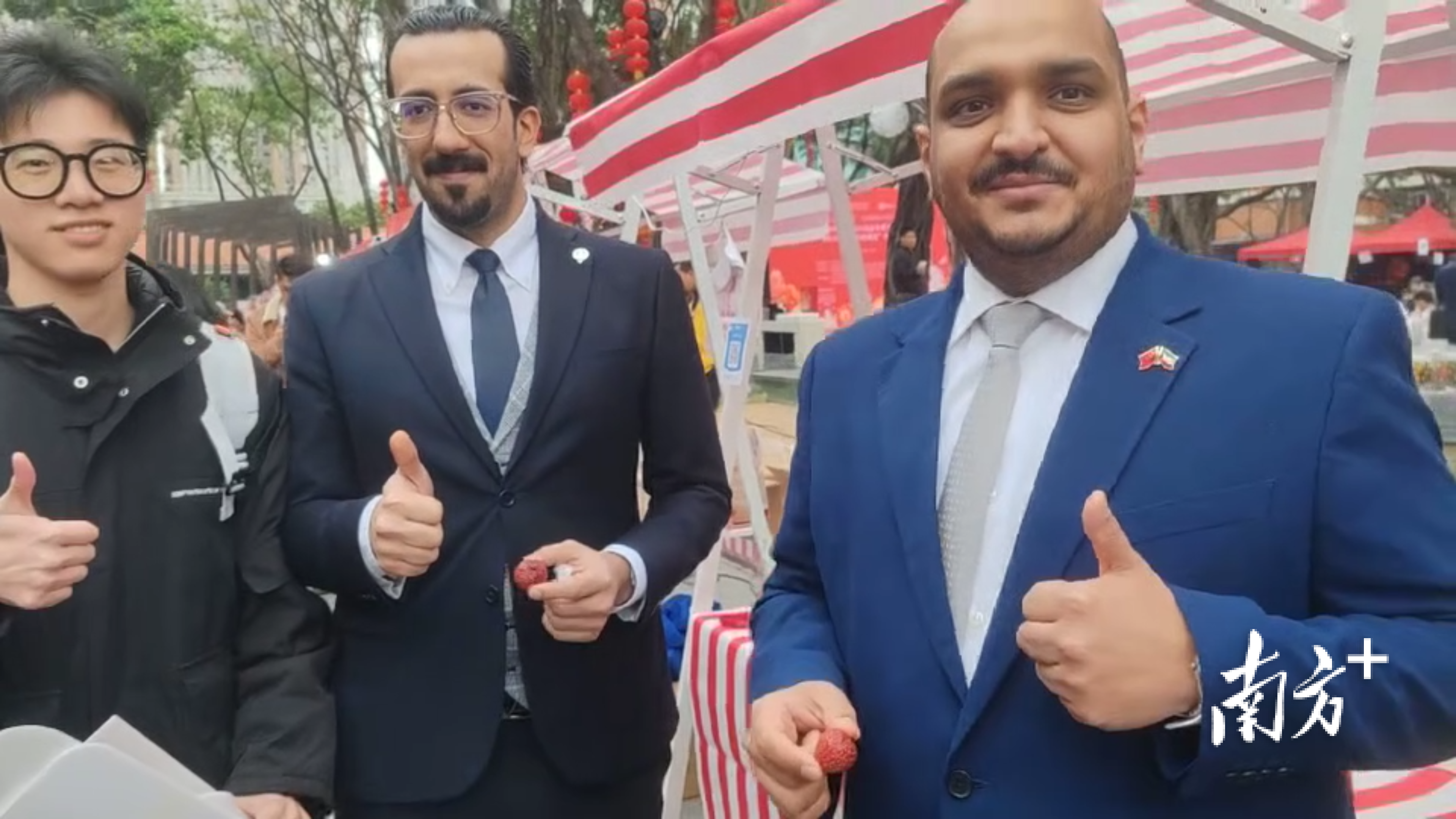 外国友人现场尝过冻眠荔枝后竖起大拇指。