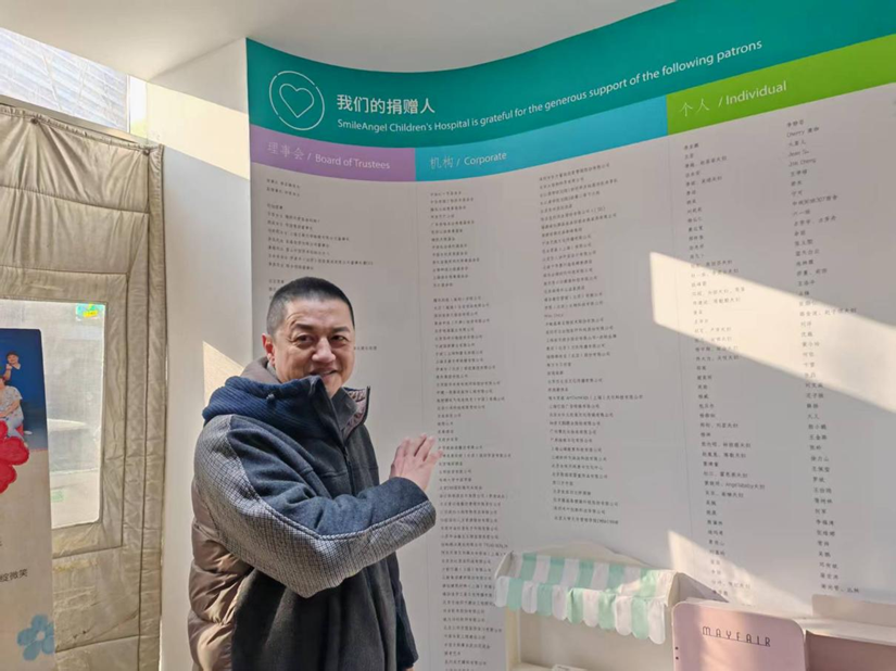 嫣然天使儿童医院一楼,李亚鹏在“我们的捐赠人”墙下介绍医院的诞生历程 图源:“公益时报”微信公众号