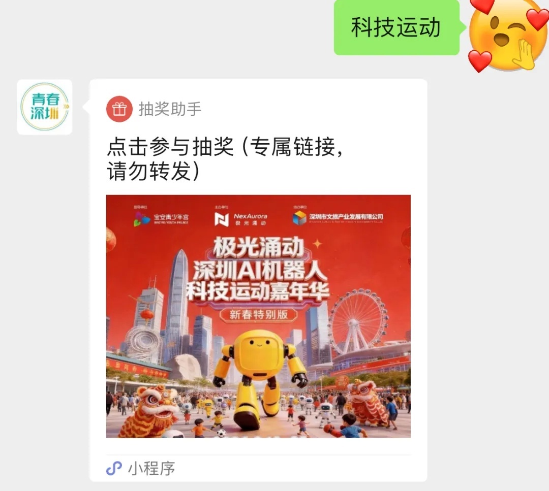 在“青春深圳”微信公众号对话框,回复关键词:【科技运动】即可参与抽奖活动。