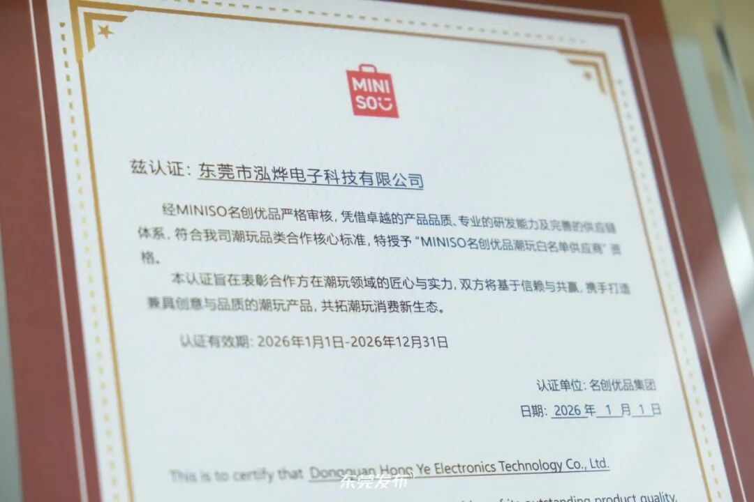 2026年,在名创优品集团全球供应商质量大会上,泓烨获颁“卓越IP质造奖”,同时,也凭借卓越的产品品质、专业的研发能力和完整的供应链体系,成为了“MINISO名创优品潮玩白名单供应商”。