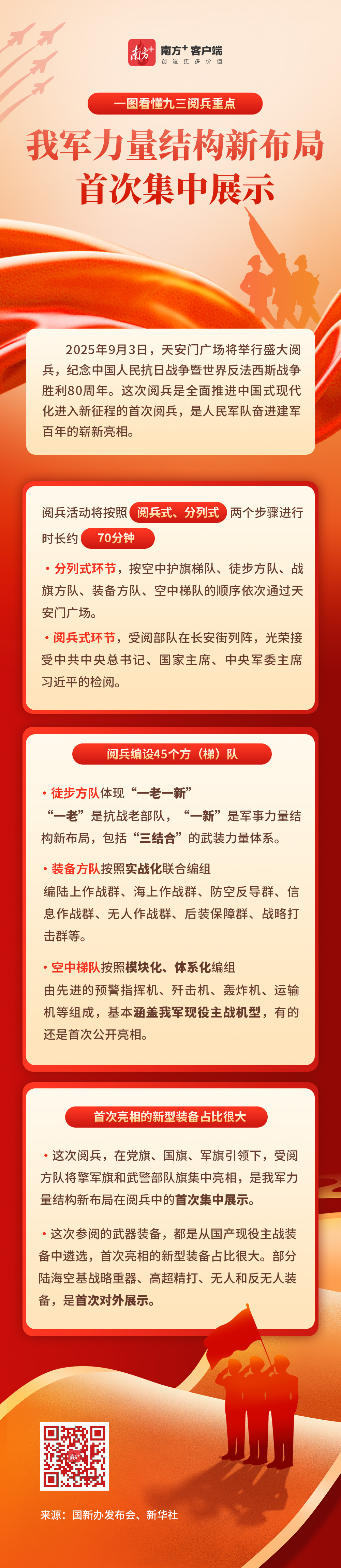 8月20日,国务院新闻办公室举行新闻发布会。相关负责人介绍,目前,阅兵各项准备已基本完成,全体受阅官兵将以昂扬的精神状态接受党和人民检阅。九三阅兵重点,一图带你看懂▼