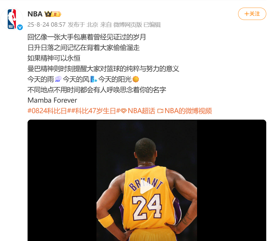 洛杉矶湖人队24日通过官方账号更新动态,向已故名宿科比·布莱恩特送上47岁生日祝福。NBA官方也发文致敬曼巴精神。