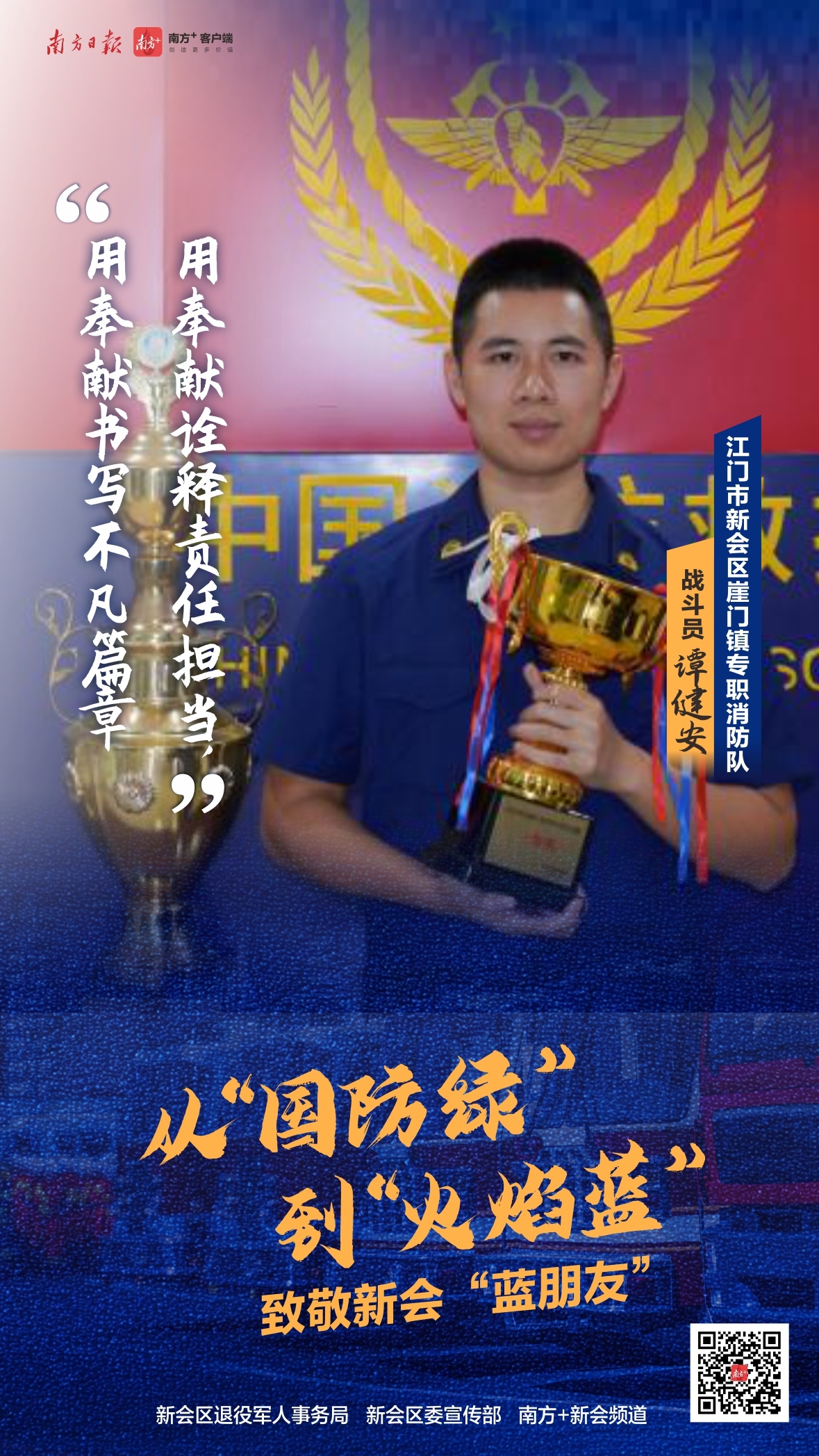 从“国防绿”到“消防蓝”,致敬新会“蓝朋友”:(可多选) 国家综合性消防救援队黎家麟:消防知识心中记,平安保障你我他 圭峰会城袁启乐:对党忠诚,纪律严明,赴汤蹈火,竭诚为民 圭峰会城陈泳年:褪不去的是军人本色,燃不尽的是为民初心 崖门镇谭健安:用奉献诠释责任担当,用奉献书写不凡篇章 沙堆镇曾伟武:物有所长,人有所短,发挥长处,我在行 睦洲镇彭水明:以防为先,以救为要 大鳌镇陈锦潮:戎装虽卸,责任不卸 提交
