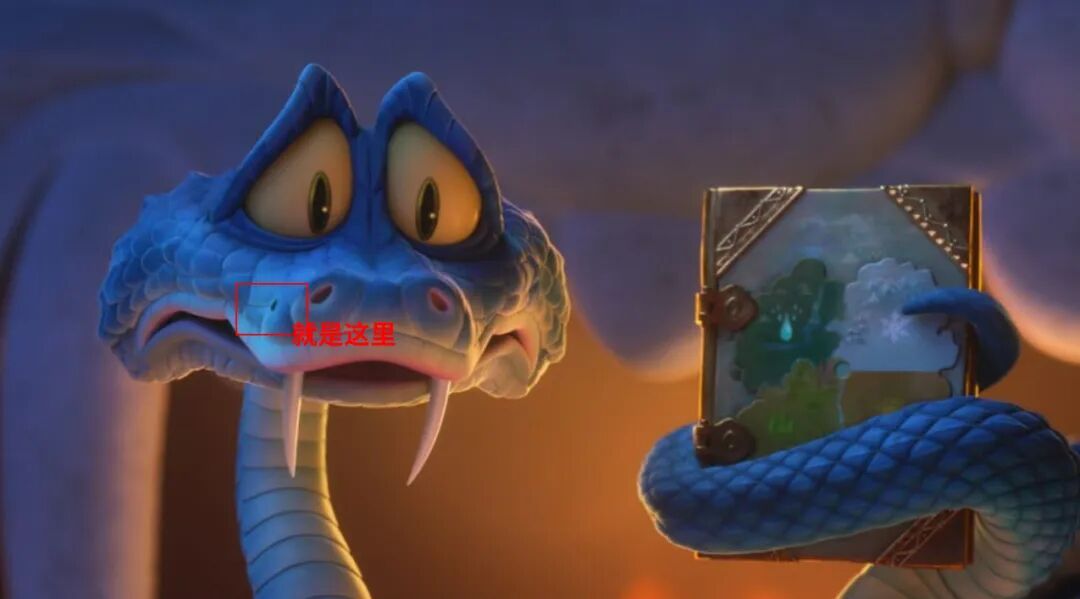 盖瑞脸部还有一个值得注意的点是眼睑。蛇其实并没有眼睑,只有一层透明角质,不能眨眼。但这样会损失太多面部表情,所以动画组只好在眼睛上面加了一个尖角型的鳞片结构,同时充当眼睑和眉毛。