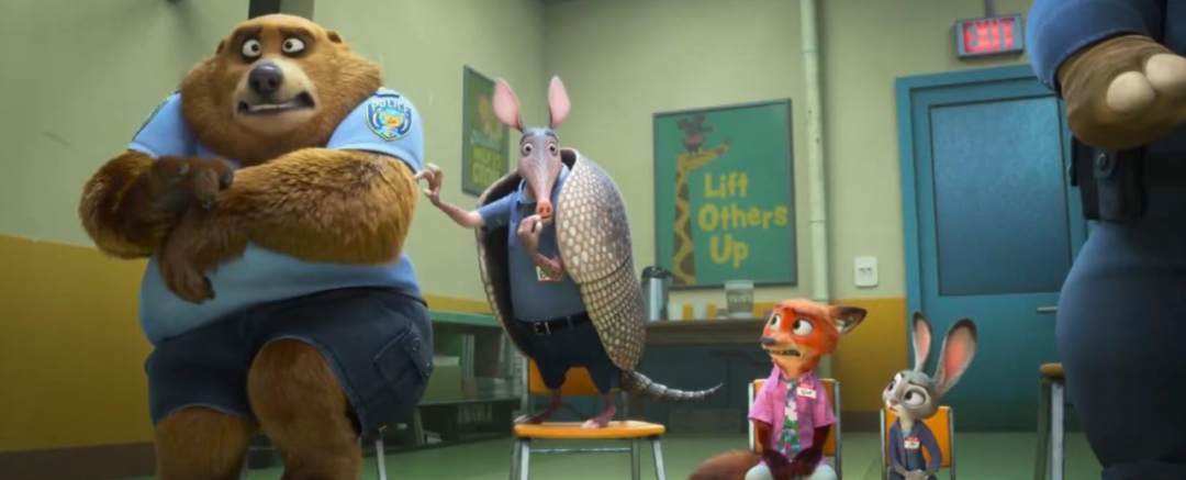 犰狳警官(忍不住去挠自己灰熊同伴的毛的那位)有一个奇怪的设计:他的警服是在甲壳里面的,壳像披风一样套在警服外。这个实际上是做不到的,犰狳的壳长在身上拿不下来。其他动画片里乌龟壳也经常被当成可穿戴装备,那个更加离谱,因为乌龟的壳是和骨骼直接连在一起的。