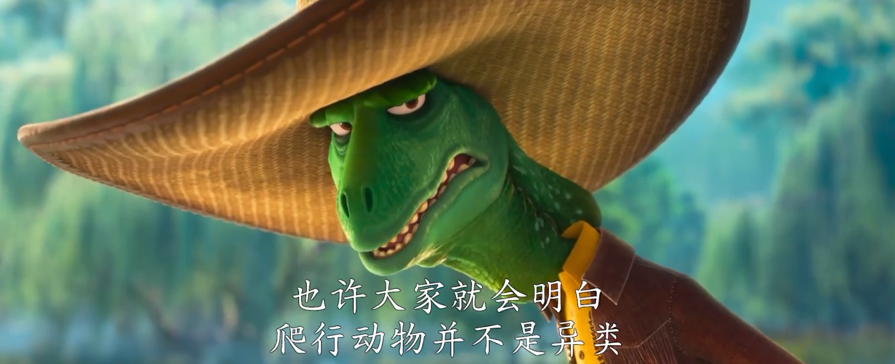 于是大家抵达了沼泽市场。市场的大字标语“鱼类是食物”,肯定是为了呼应《海底总动员》的著名口号“鱼类是朋友,不是食物”。这个事情想来还挺微妙的,如果两爬都有了智慧,鱼类为啥没有呢?后面果然出现了很多吃鱼的场景,但还混进了两头大嚼海草的海狮,这也挺怪的,海狮的食物应该几乎全是鱼类和海洋软体动物。