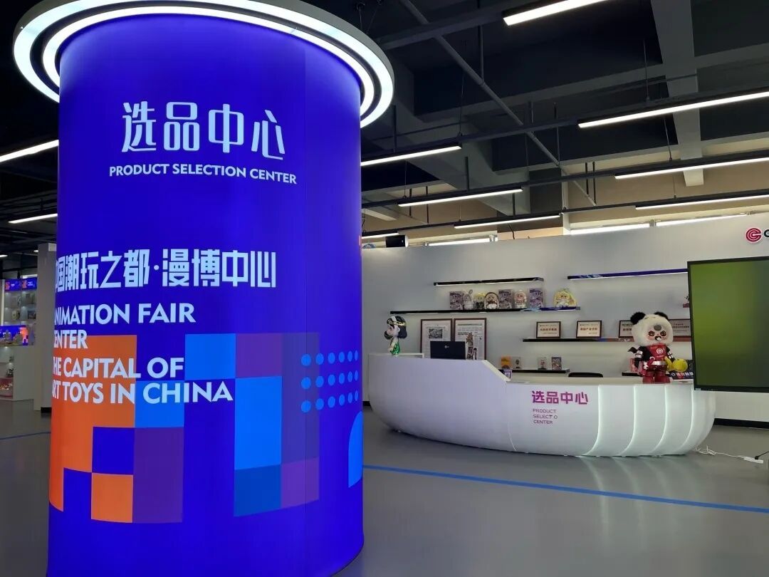 2个产业特色展厅分别是:中国潮玩之都展厅和线下选品中心。线下选品中心依托智能供需匹配系统和一站式产业服务,呈现“IP、产品、产能、渠道、服务”潮玩全产业链生态,目前汇聚了约10000件潮玩产品,覆盖盲盒、手办、机甲模型、文创衍生品等,打造全品类沉浸式选品体验。配套建设的网上潮玩中心聚焦“IP、产品、产能、渠道、服务”五大功能板块,整合全国潮玩品牌、制造商、设计师、采购商资源,打造粤港澳大湾区首个专注于潮玩产业的B2B在线供需平台,目前已进驻480家企业、上架4300多件产品。