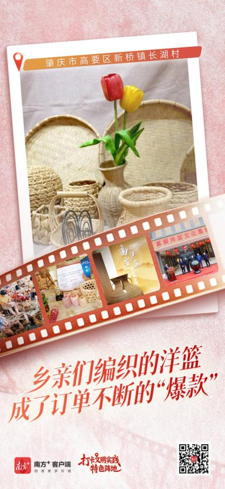 在肇庆市高要区新桥镇长湖村,村民们将一根根竹篾在手中翻折、穿插,编织成承载百年非遗的洋篮,这也是带动村民增收致富的“金篮”。以洋篮编织为纽带,长湖村让非遗传承与文明实践相融共生,勾勒出物质富裕、精神丰盈的乡村新画卷。(详情>>)