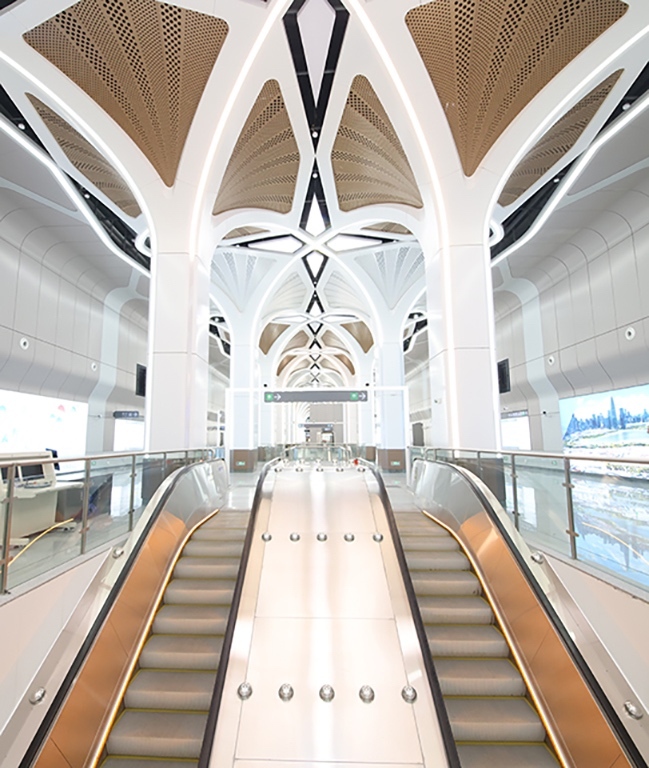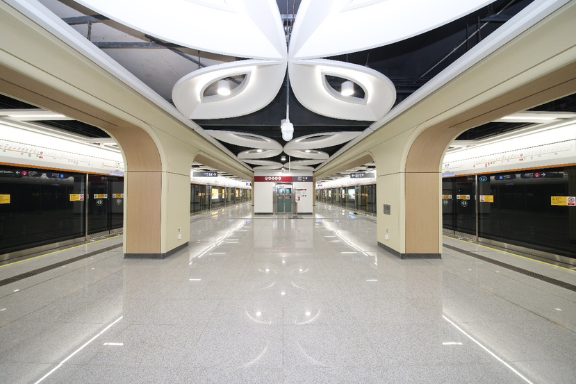 ● 石鼓站:石鼓站为特色站之一,毗邻大疆天空之城总部、鹏城实验室、万科云城设计公社等,具有科技创新和艺术创意的文化特征。车站以“无人机”为设计灵感,将机翼、机身的形态,抽象转化为标准化、模块化的装饰单元,构筑出车站空间的主体框架,宛如一架巨型穿梭机,车站立柱犹如科技之树,向上生长,寓意城市的蓬勃发展。