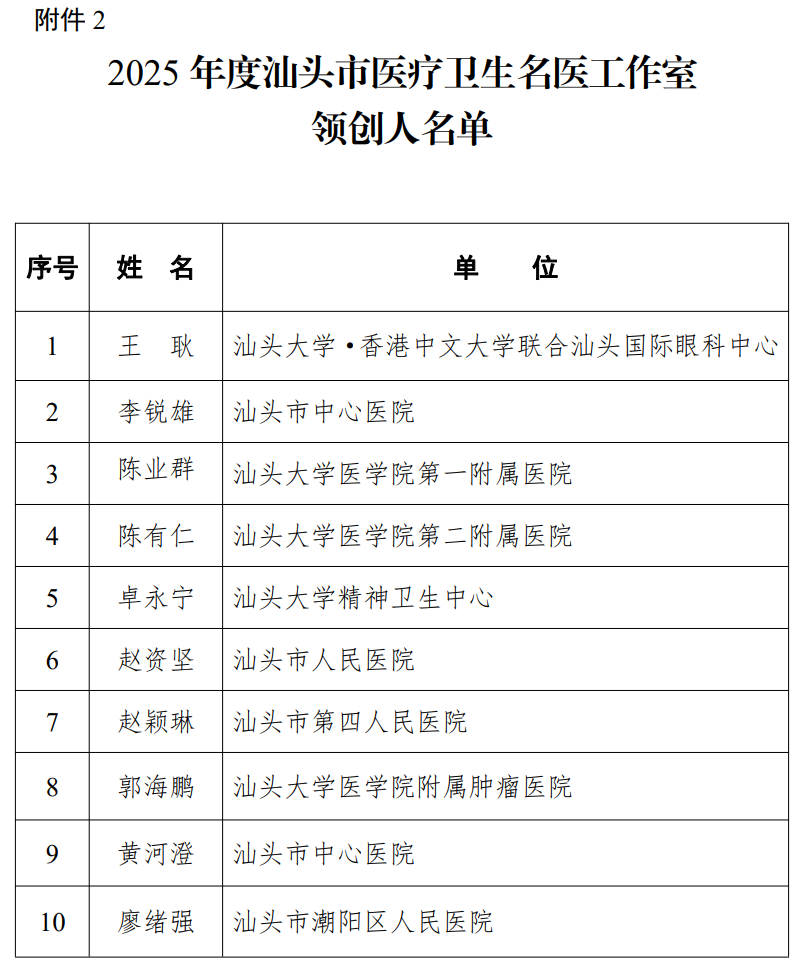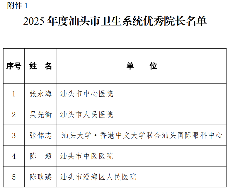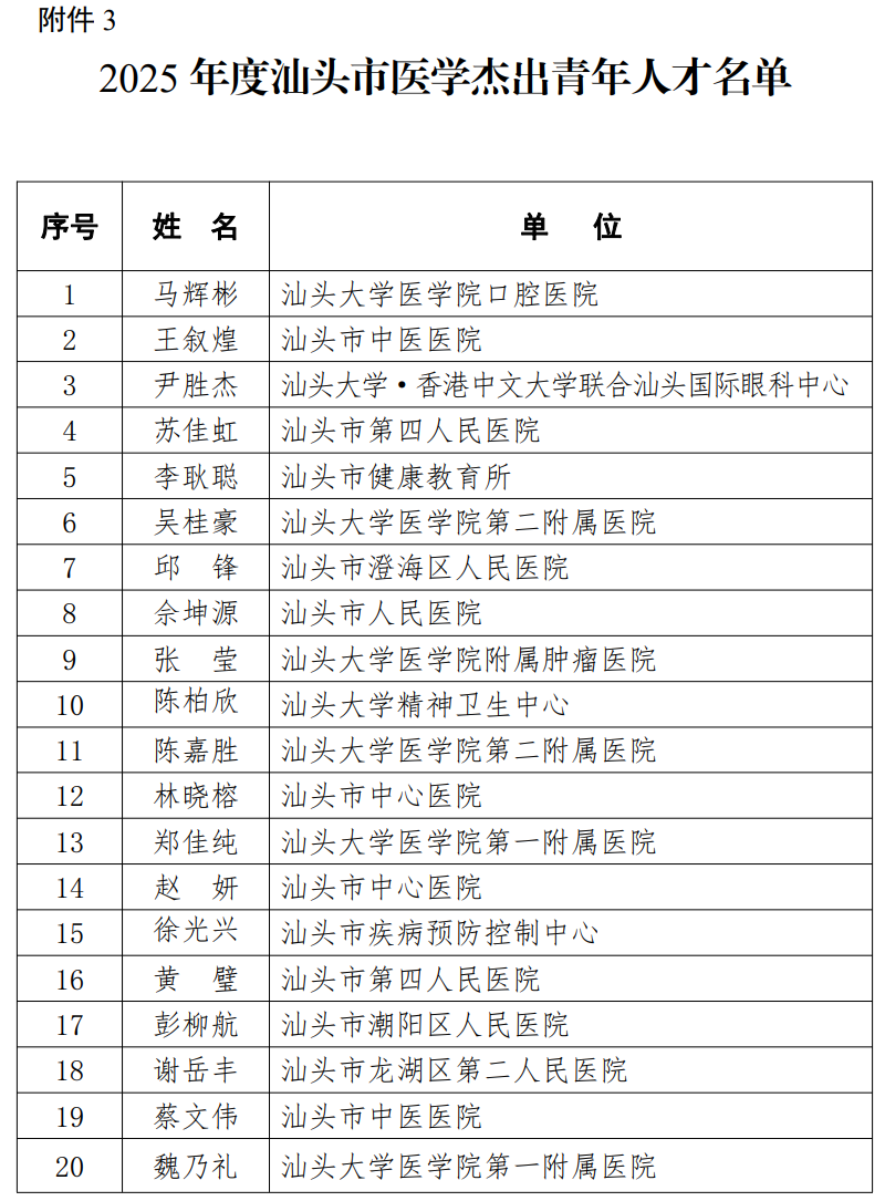 此次人才项目认定经申报、初审、复审、评议及公示程序,最终认定张永海等5人为汕头市卫生系统优秀院长,王耿等10人为汕头市医疗卫生名医工作室领创人,马辉彬等20人为汕头市医学杰出青年人才。
