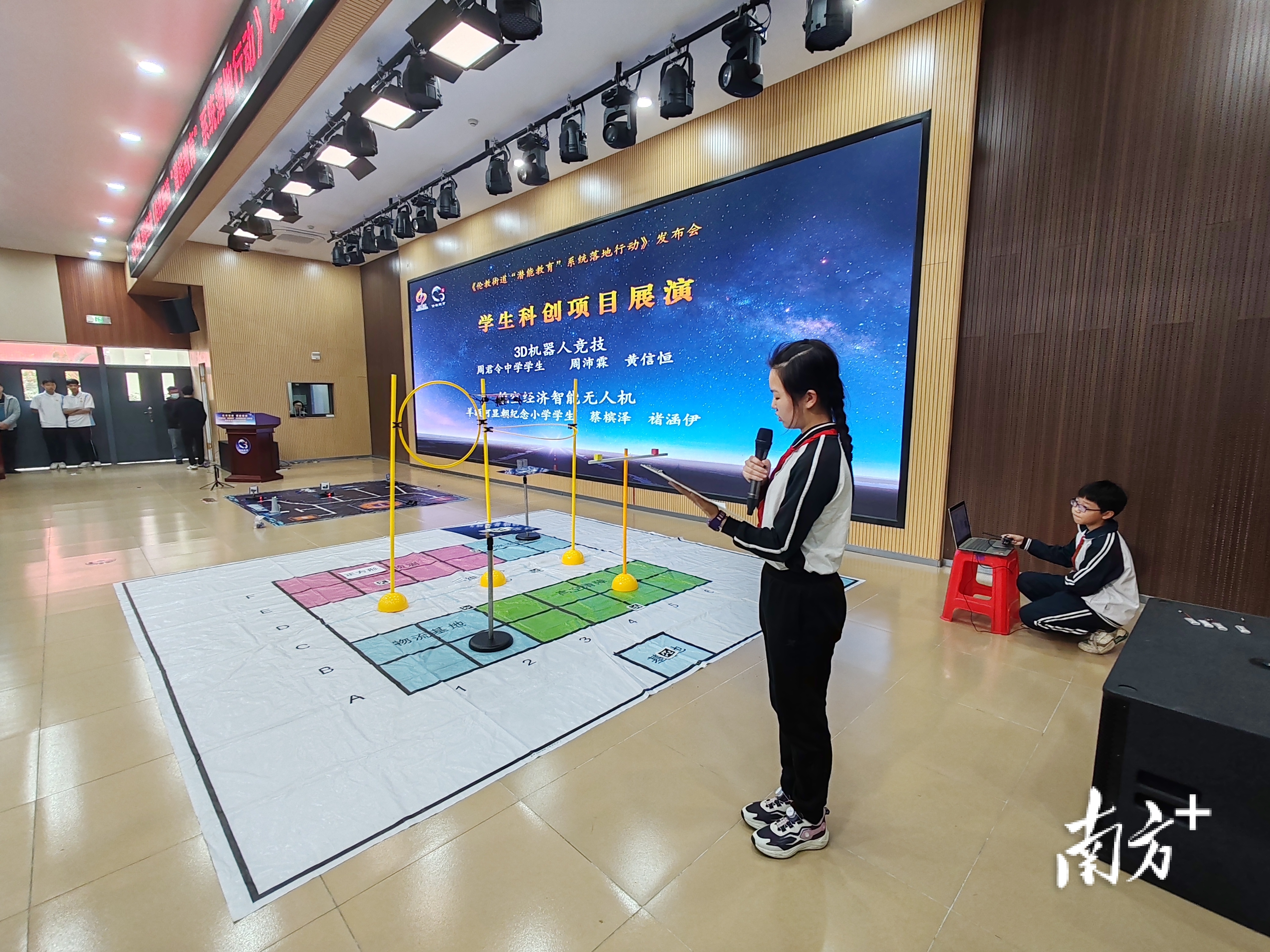 羊额何显朝纪念小学学生则结合伦教“珠宝小镇”产业特色,演示了无人机珠宝巡检系统,展现“科技服务本土”的创新理念。两项展演生动体现出伦教“课程—社团—项目—展演”一体化培育体系的成效,展现了学生工程思维、创新意识及解决实际问题的能力。