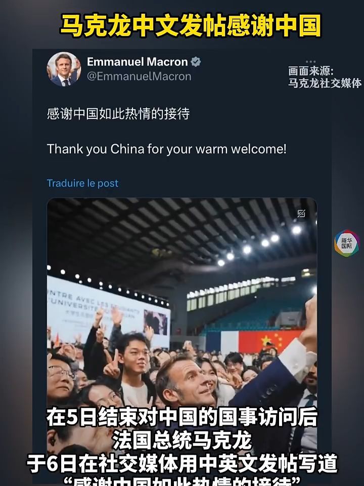 00:22 马克龙中文发帖感谢中国在5日结束对中国的国事访问后,法国总统马克龙于6日在社交媒体用中英文发帖写道,“感谢中国如此热情的接待”。马克龙还在帖文中附上了一条时长约1分钟的视频,展现他此次访华的精彩瞬间。 编辑 邓素凡 订阅后可查看全文(剩余80%)