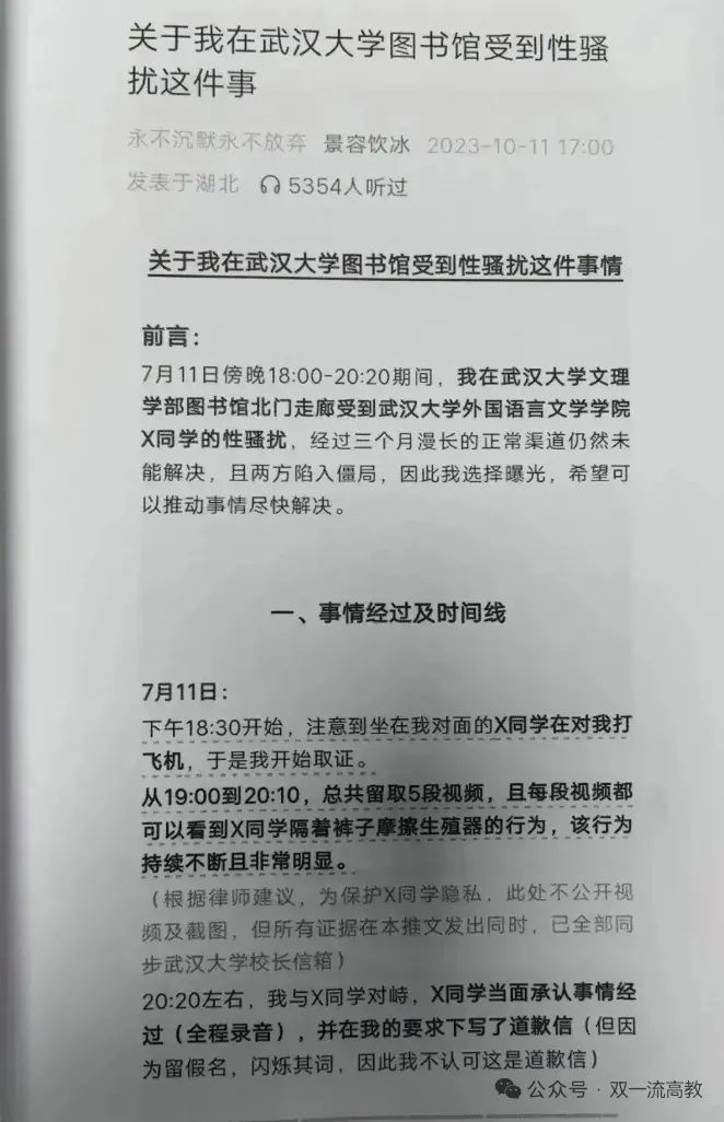 这场风波成为舆论焦点,始自2023年10月。彼时,杨某某认为自己在图书馆遭遇性骚扰,拍视频取证、要求肖某某写下道歉信后,杨某某将其举报到学校。根据女生举报帖,武大在10月10日通过辅导员告知其:学院对事件定性仍存疑,无法确定性骚扰。不满于学校的回复,杨某某于翌日在网上发帖陈述自己的遭遇。