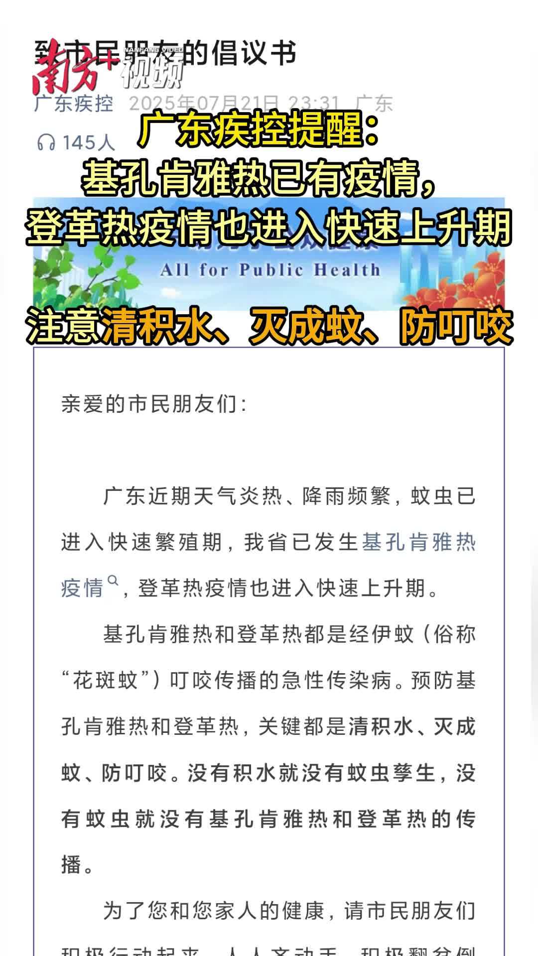 7月21日深夜,广东省疾病预防控制中心发布“致市民朋友的倡议书”,倡议书提醒,广东近期蚊虫已进入快速繁殖期,广东省已发生基孔肯雅热疫情,登革热疫情也进入快速上升期,号召大家清积水、灭成蚊、防叮咬。