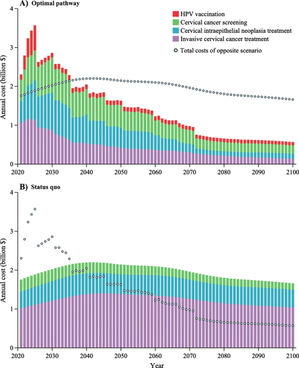 采纳结合HPV疫苗接种和宫颈癌筛查的最优策略与维持现状的经济成本。