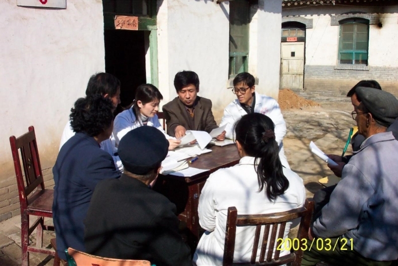 2003年3月,赵方辉(左三穿白大卦的女士)和同事一起开展HPV病毒感染情况的人群流行病学调查。