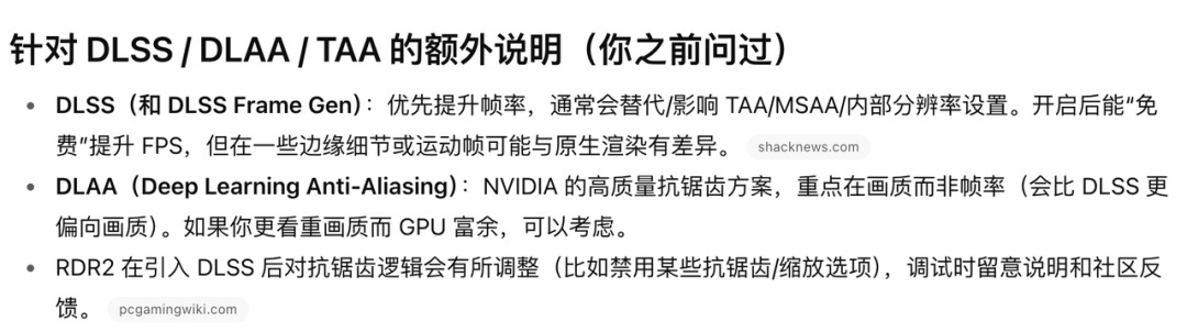 但在 Atlas 上,除了这些,它会记得我更早之前提到过的电脑配置、显示设置、看过的帖子,甚至我已经尝试过哪些方法。然后它生成了一个针对性的建议,“你这个 Bug,可能和 DLSS 模式有关。你之前提到游戏开的是‘超高质量’,建议尝试 DLAA 或关闭光追测试下帧率变化。”