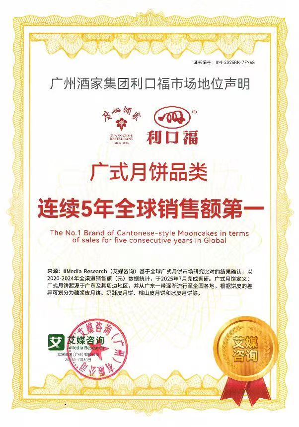 在"粤味出海"战略的持续推进下,广州酒家集团坚持传统制作工艺流程的标准化和工业化转化应用,使中秋月饼、速冻点心、莲蓉馅料、广式饼酥等四大系列产品畅销美加、欧盟、中东等20余国。2024年食品外贸销售额近7000万元,同比增长超40%。根据艾媒咨询数据统计,自2020年至今,广州酒家集团中秋月饼连续五年全球销售额第一。一盒虾饺承载广府早茶文化,一枚双黄白莲蓉月饼传递东方团圆哲学,这些"可携带的中华文化符号"正通过跨境电商平台与海外商超渠道,潜移默化地影响全球食客的味蕾。