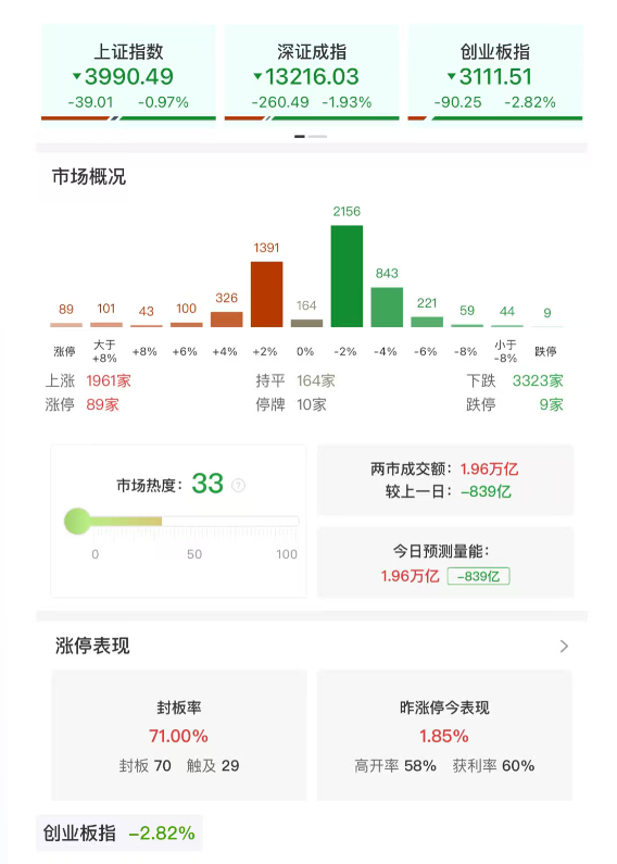 11月14日,A股三大指数集体下跌,截至收盘,上证指数跌0.97%,深证成指跌1.93%,创业板指跌2.82%;北证50跌1.01%。沪深两市成交额约19580.79亿元,较前一个交易日缩量约838.83亿元。全市场1961只股票上涨、3323只股票下跌,其中89只涨停、9只跌停。