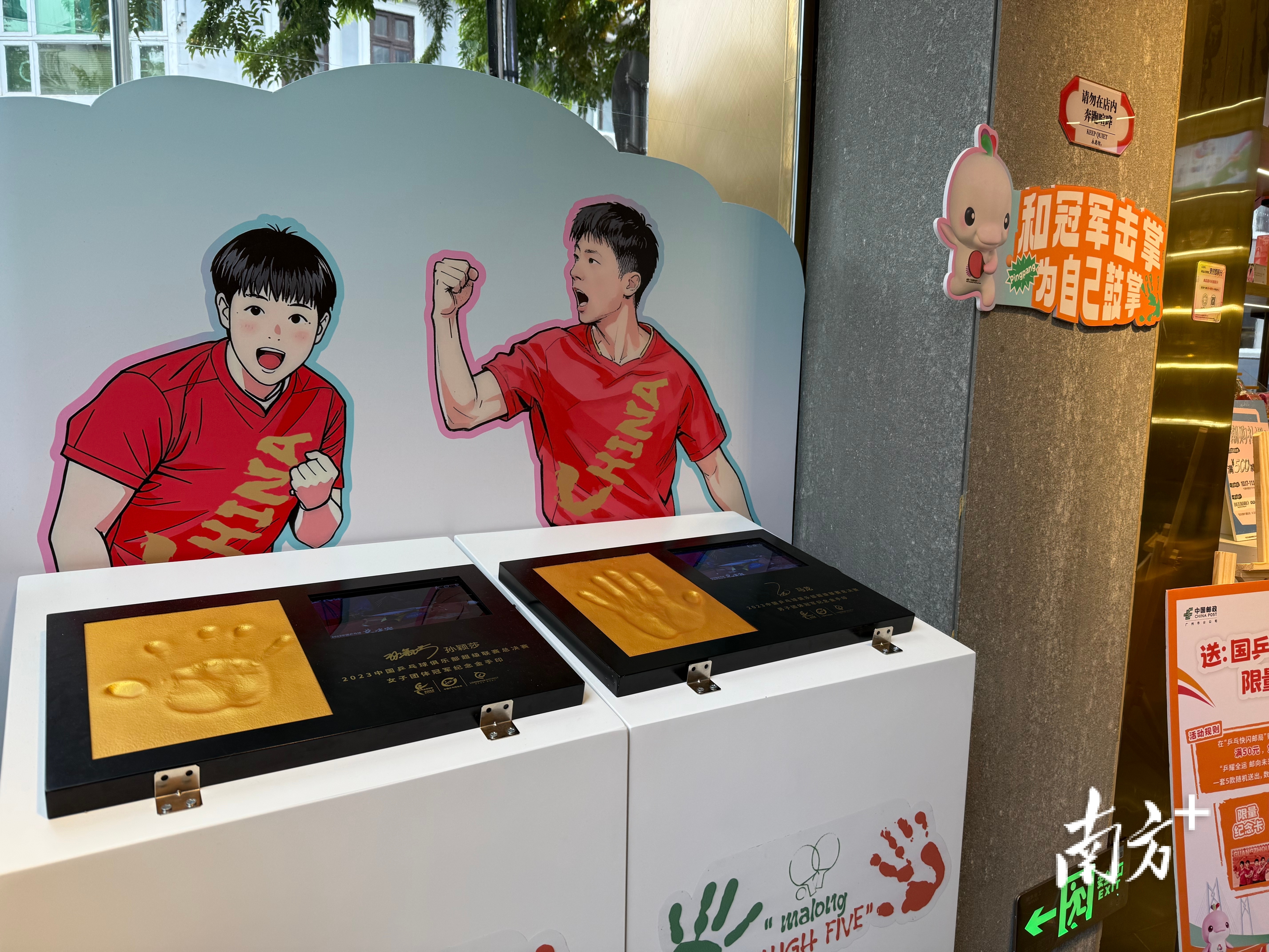 永庆坊快闪邮局里专门准备了奥运冠军马龙和孙颖莎的金手印和签名球拍,购买全运产品满50元还能免费获得“乒耀全运 邮向未来”限量纪念卡一张,吸引不少乒乓球爱好者前来打卡。