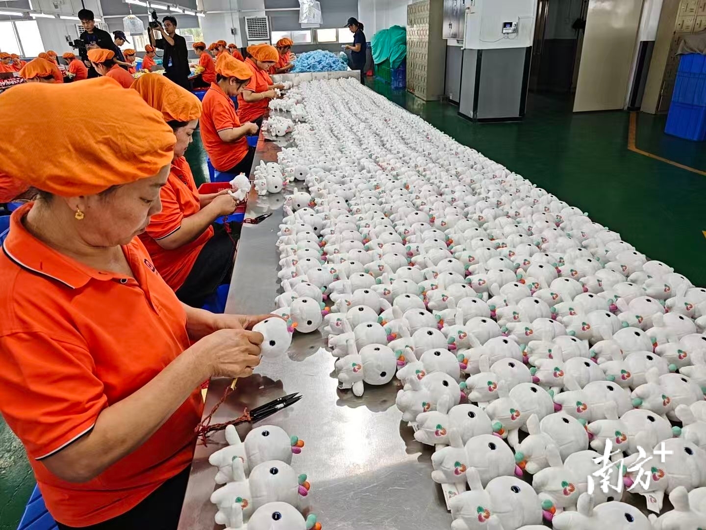 东莞茶山镇的东莞康达玩具礼品有限公司车间内,工人还在赶制“喜洋洋”“乐融融”的毛绒公仔。康达玩具设计了多个篮球和举重的相关款式,还将分别代表广州、香港、澳门的木棉花、紫荆花、莲花融入设计当中。