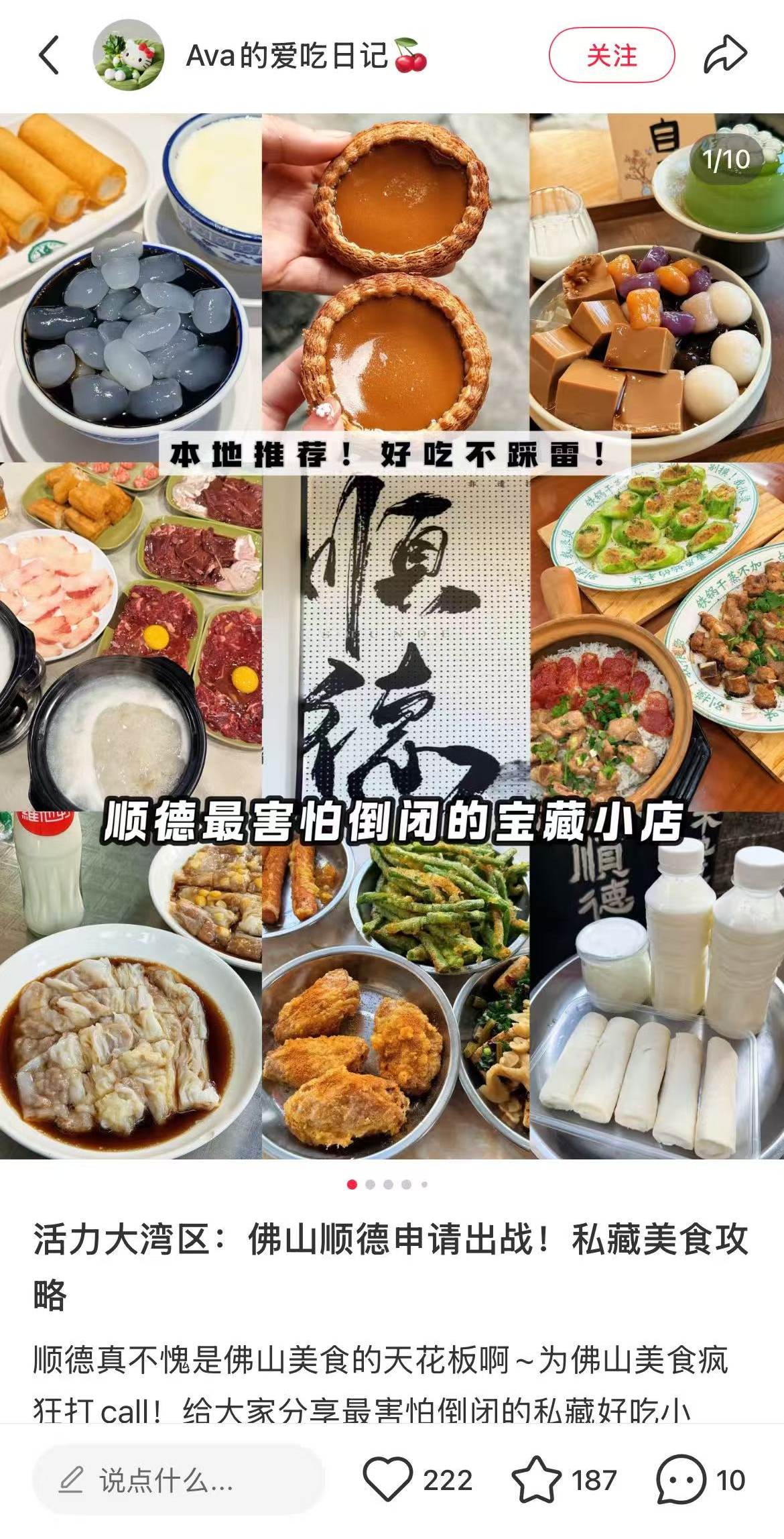 “顺德真不愧是佛山美食的天花板啊~为佛山美食疯狂打Call!”日常分享各地美食,在小红书拥有23.3万粉丝的博主“Ava的爱吃日记”,在话题下分享了TA认为的顺德私藏好吃小店,引来众多读者点赞认可。