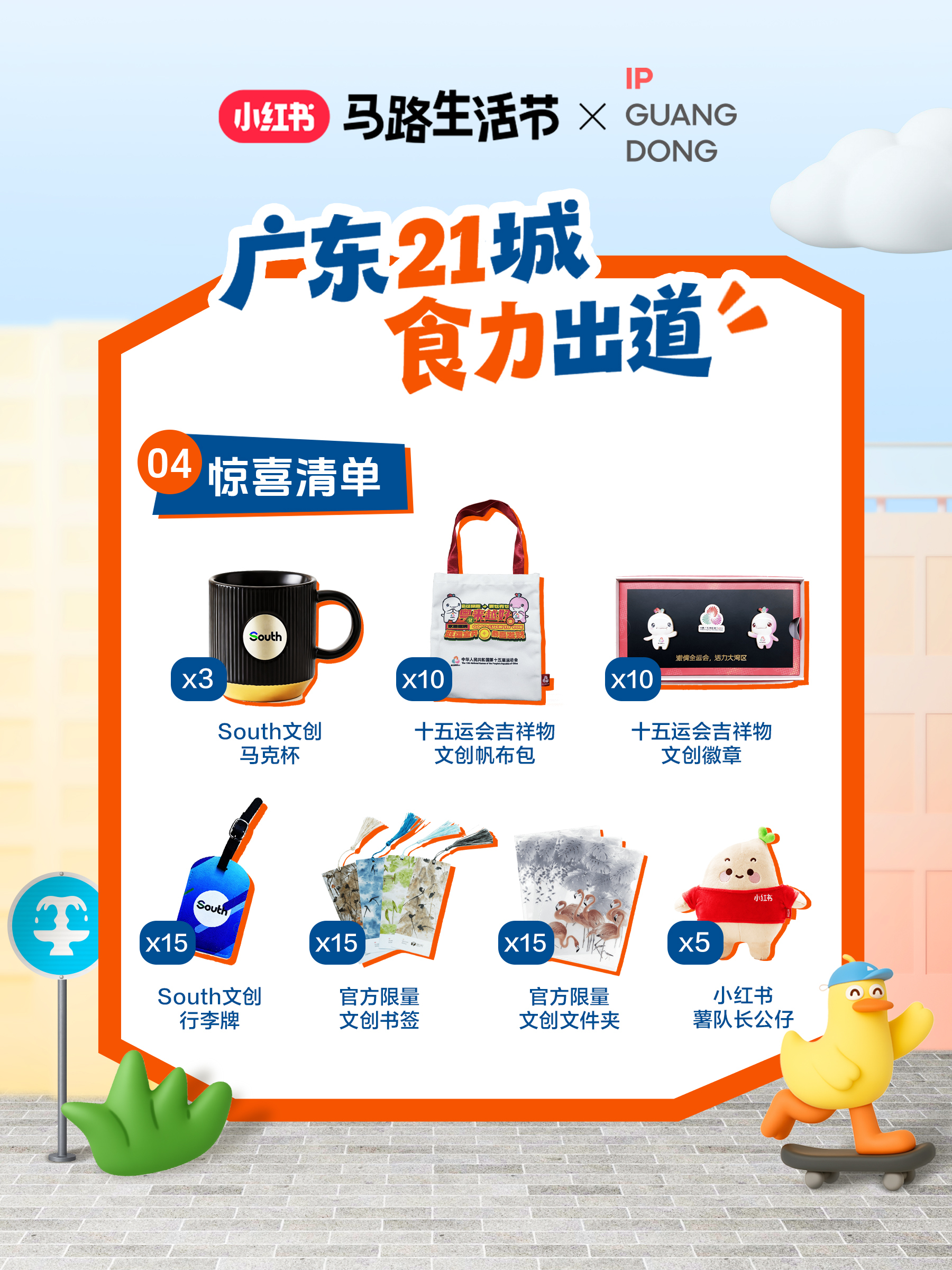本次活动还增设丰富玩法与多重奖励。从10月21日0时至11月20日12时,用户可以在小红书上搜索“#广东21城食力出道”,点击进入H5页面,参与互动小游戏,完成打卡任务积攒积分,获得许愿抽奖机会。主办方将在11月20日13时开奖,解锁包括South文创周边、十五运会吉祥物周边、小红书薯队长公仔等7种心动奖品。