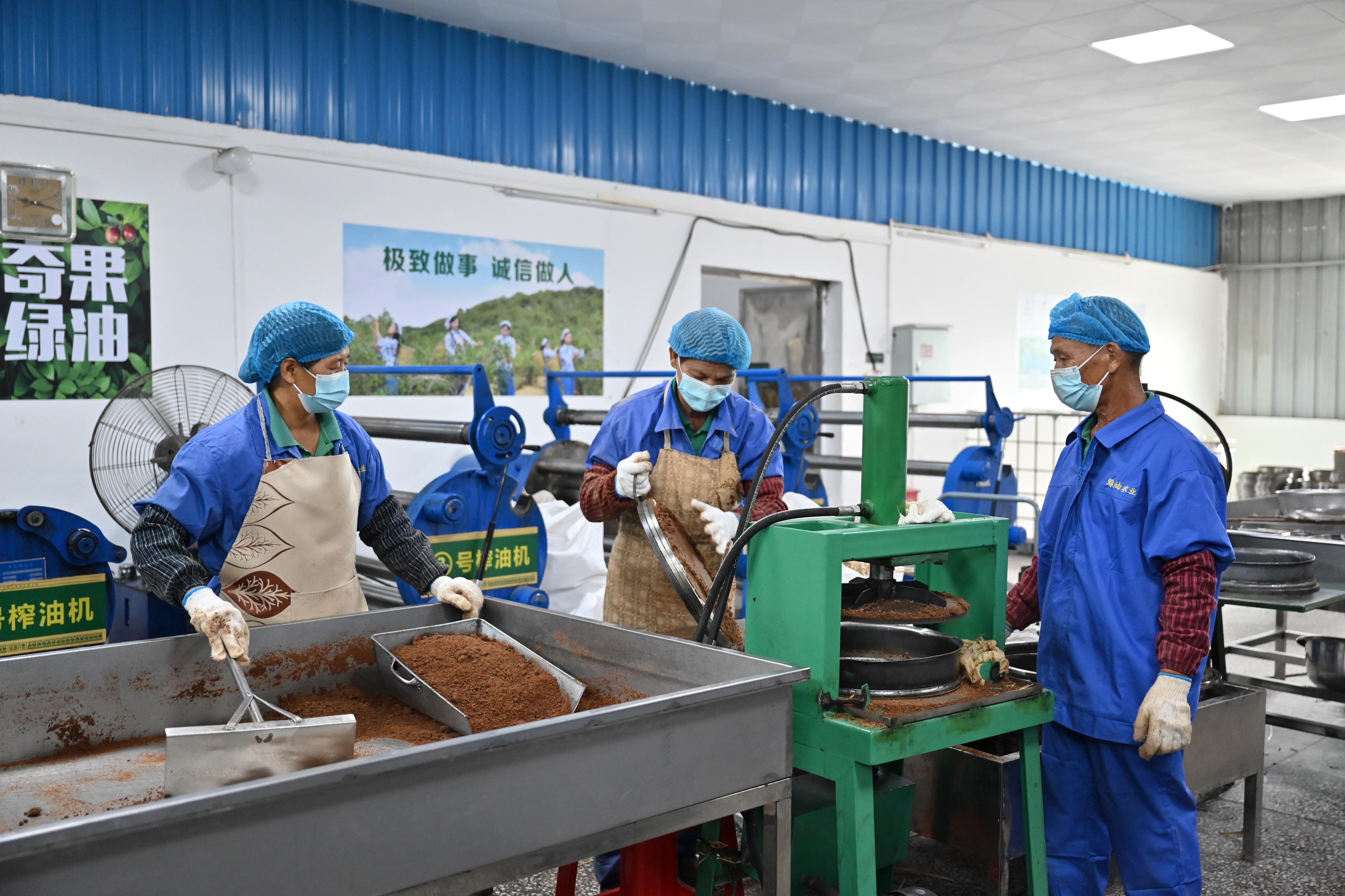 如今,河源在全省油茶版图中体量最大、增速稳健,其丰收节奏与扩面增产走势,正是全省油茶产业发展的缩影。梅州、韶关、清远、茂名等油茶重点市已全面进入采摘高峰期,各地同步开启“鲜果晾晒—剥壳—烘干—压榨”的生产流程,精炼、灌装环节有序推进,全省呈现出“同期开榨、集中上市”的产销盛况。“今年全省油茶籽产量稳中有升,预计达26万吨,11月中旬前就能完成所有鲜果采摘。”广东省林业产业协会常务副秘书长白昆立介绍道。