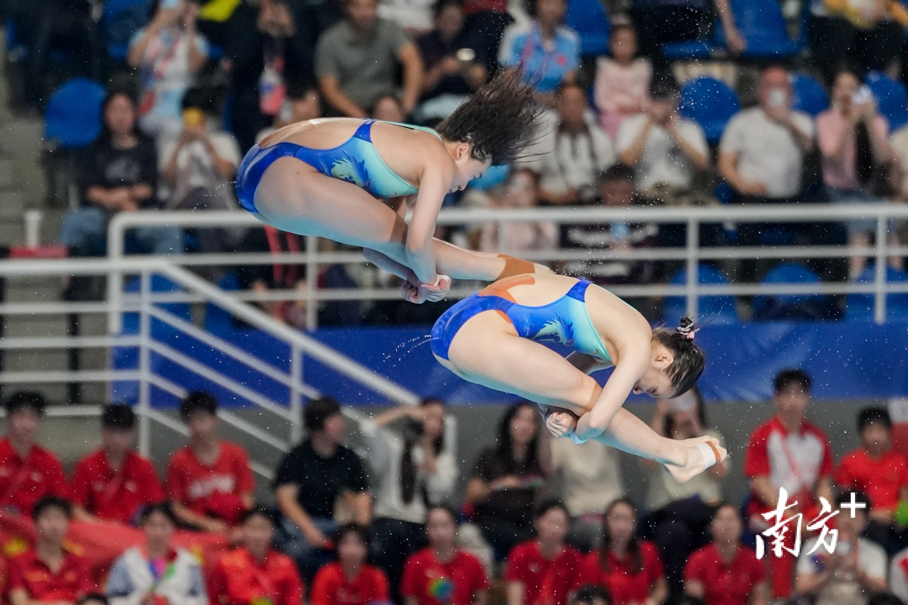 陈芋汐、掌敏洁完成比赛的最后一跃。