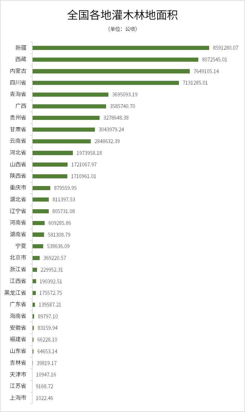 灌木林地是指灌木覆盖度 > 40% 的林地(不包括灌丛沼泽)。新疆在这一地类上面积最大,约 859 .13万公顷。西藏(807.25 万公顷)、内蒙古(764.91 万公顷)、四川(713.13万公顷)、青海(369.51万公顷)别分是第二至第五名。从各级行政区的分布情况能看出,其在不同区域的分布与当地的自然环境密切相关。
