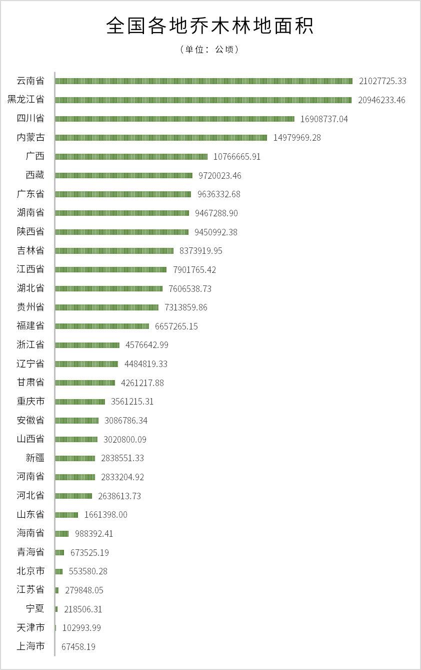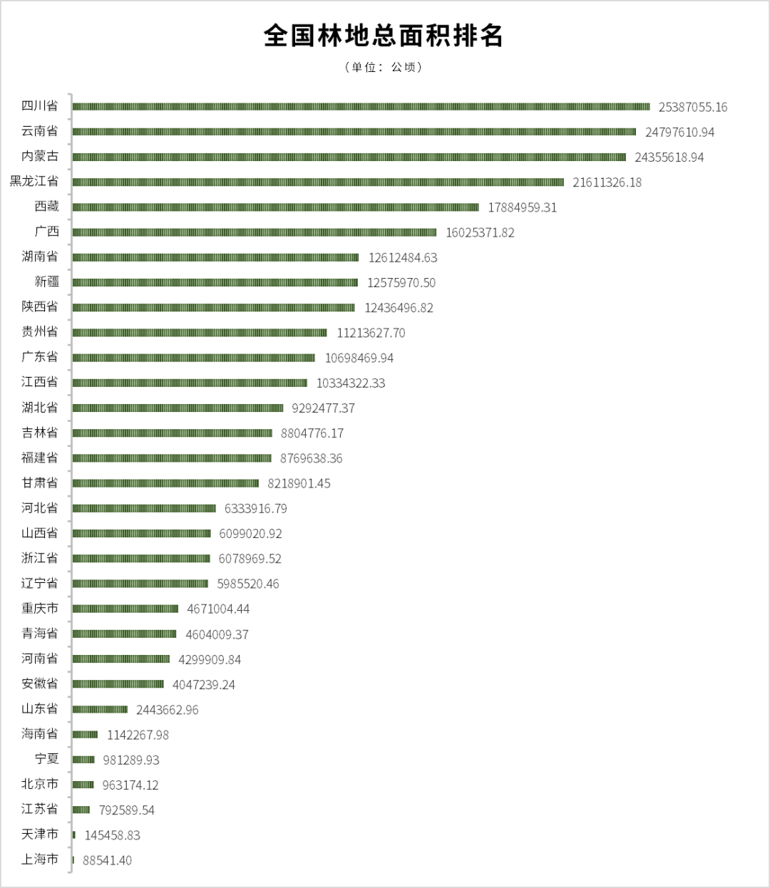 从全国范围来看,林地资源在各个省份的分布并不均衡。四川、云南、内蒙古、黑龙江、西藏、广西、湖南、新疆、陕西、贵州、广东、江西共12省的林地资源面积均超过1000万公顷,其林地资源面积总和占全国总面积的70.47%。
