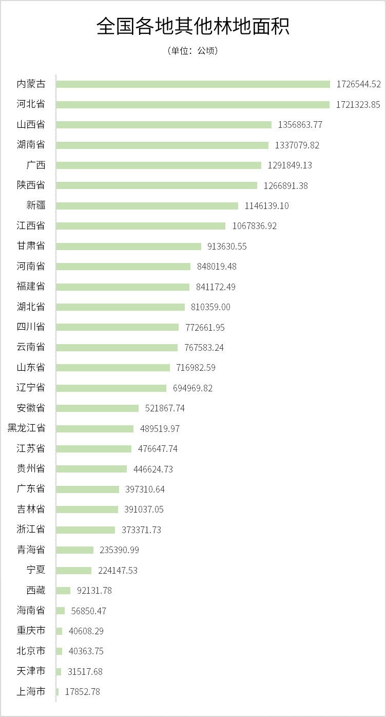 其他林地涵盖了疏林地(树木郁闭度≥0.1、<0.2 的林地)、未成林地、迹地、苗圃等林地,内蒙古的其他林地面积最多,为 172.65 万公顷,河北(172.13 万公顷)、山西(135.69万公顷)、湖南(133.71万公顷)、广西(129.18 万公顷)、陕西(126.69万公顷)、新疆(114.61 万公顷)、江西(106.78万公顷)都超过百万公顷。