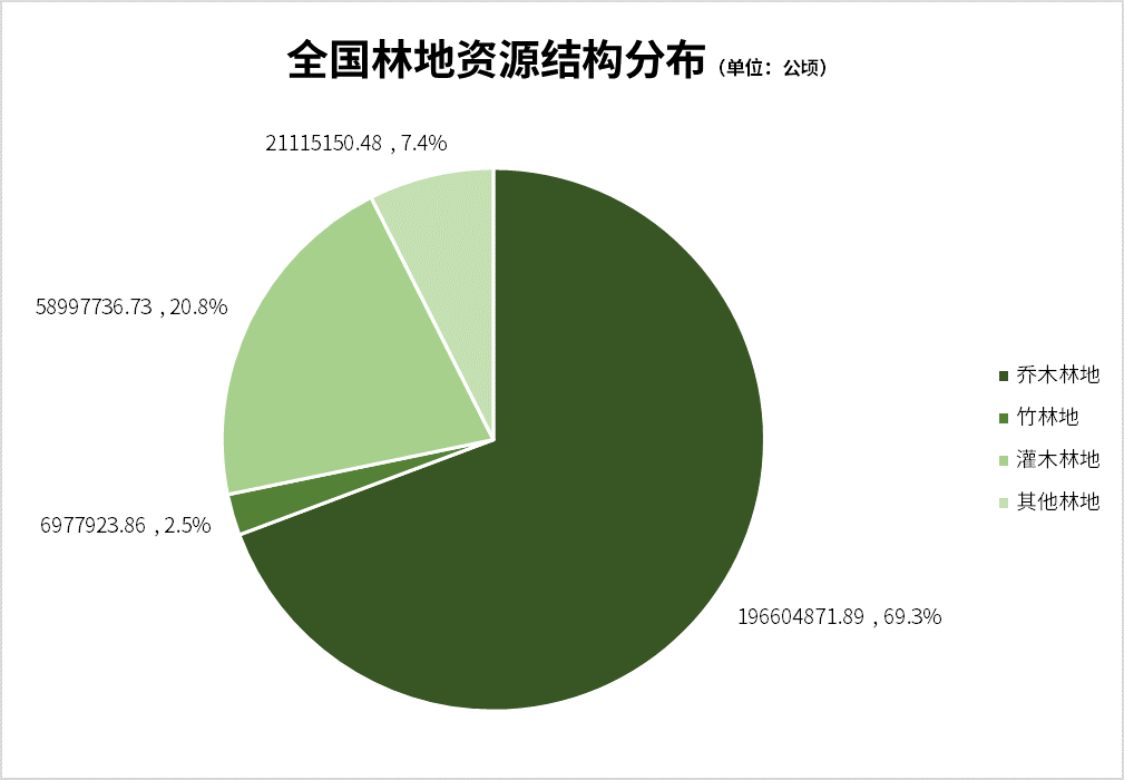 根据《2024年中国自然资源公报》,全国共有林地28369.57万公顷。其中,乔木林地19660.49万公顷,竹林地697.79万公顷,灌木林地5899.77万公顷,其他林地2111.52万公顷。全国森林面积2.47亿公顷,人工林保存面积达9240.87万公顷,居全球首位,森林覆盖率超25%,森林蓄积量206.76亿立方米。