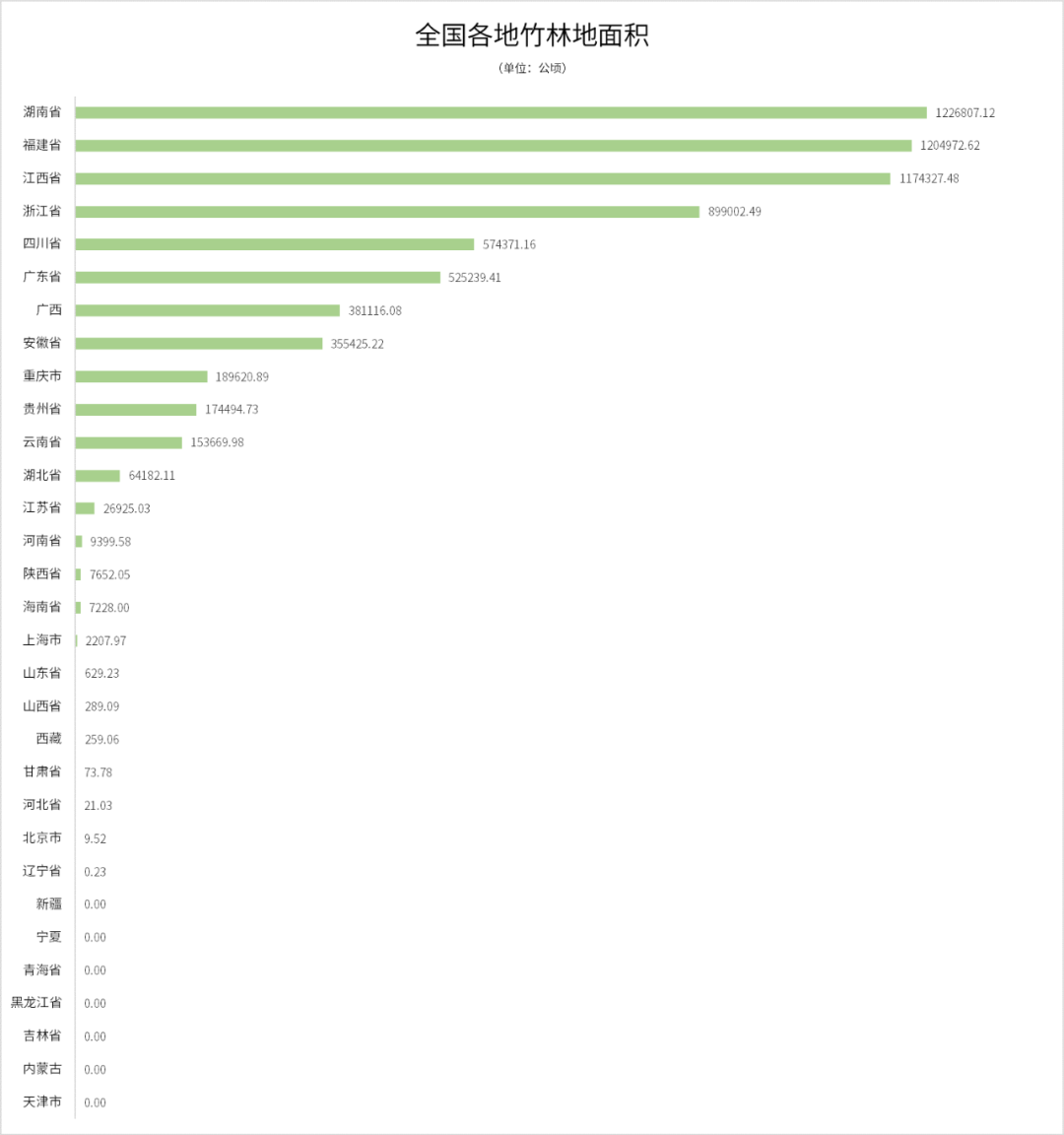 竹林地是指乔木郁闭度≥0.2 的林地,主要集中在南方地区(秦岭淮河以南)。湖南(122.68万公顷)、福建(120.50万公顷)、江西(117.43万公顷)这三个省份的竹林地面积在全国排名前三,面积均超过百万公顷,广东排名第六,面积为52.52万公顷。