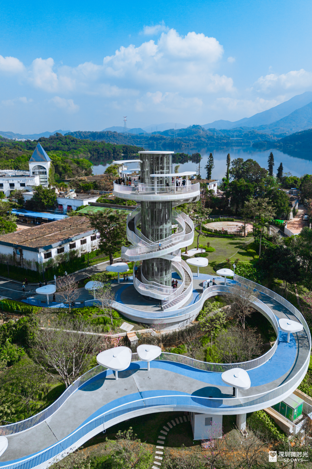 顺着大坝往前走,抬眼就能看见湖光塔,这是环深圳水库绿道的核心建筑,高19.5米,钢架和金属网搭出通透的造型,远远看着像浮在半空,塔外绕着双螺旋步道,慢慢走上去,每绕一圈,眼前的风景就换一副模样。