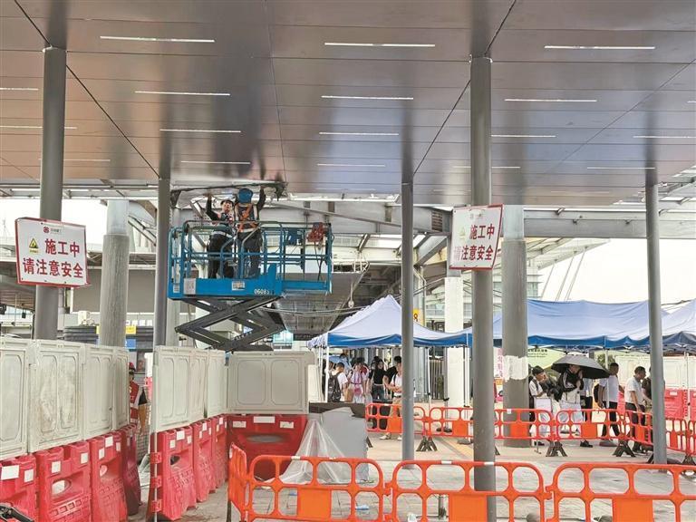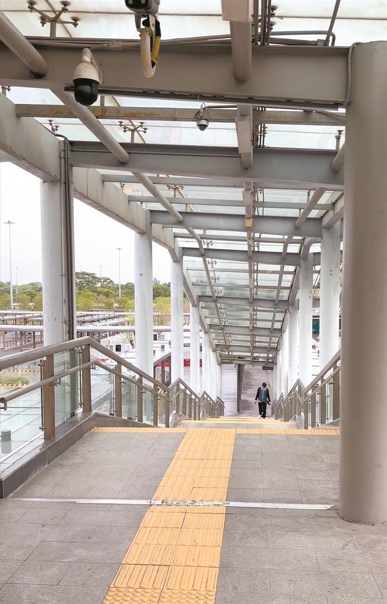 记者看到,光线透过连廊顶部的透光设计洒下,既避免强光直射,又让空间显得明亮通透。这条长达1350米的风雨连廊,自出口岸开始连接,直至公交、地铁、网约车、出租车甚至是旅游大巴等多个交通场站。无论是盛夏的烈日暴晒,还是雨季的突发降雨,连廊都能为旅客提供遮蔽。