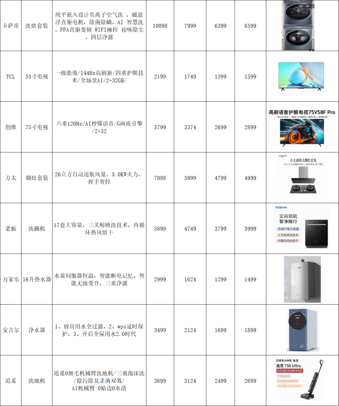 (二)品牌:海尔、卡萨帝、美的、小天鹅、海信、创维、TCL、格力、老板、方太、松下、万家乐、容声、追觅等国内各大品牌厂家。