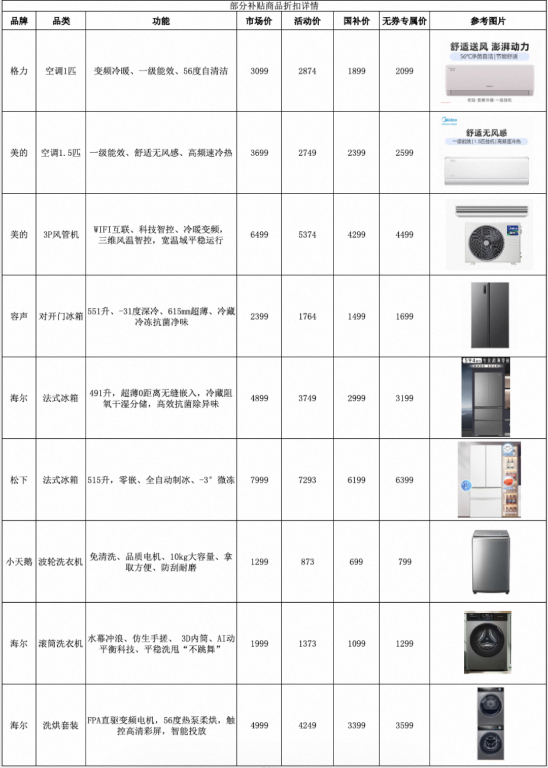 (三)补贴政策:全场商品均低于互联网官方旗舰店价格,在厂价基础上叠加消费补贴15%至30%不等。后附部分补贴商品举例,本次专项补贴范围涵盖全品类,近3000种商品,具体详情到店现场选购。