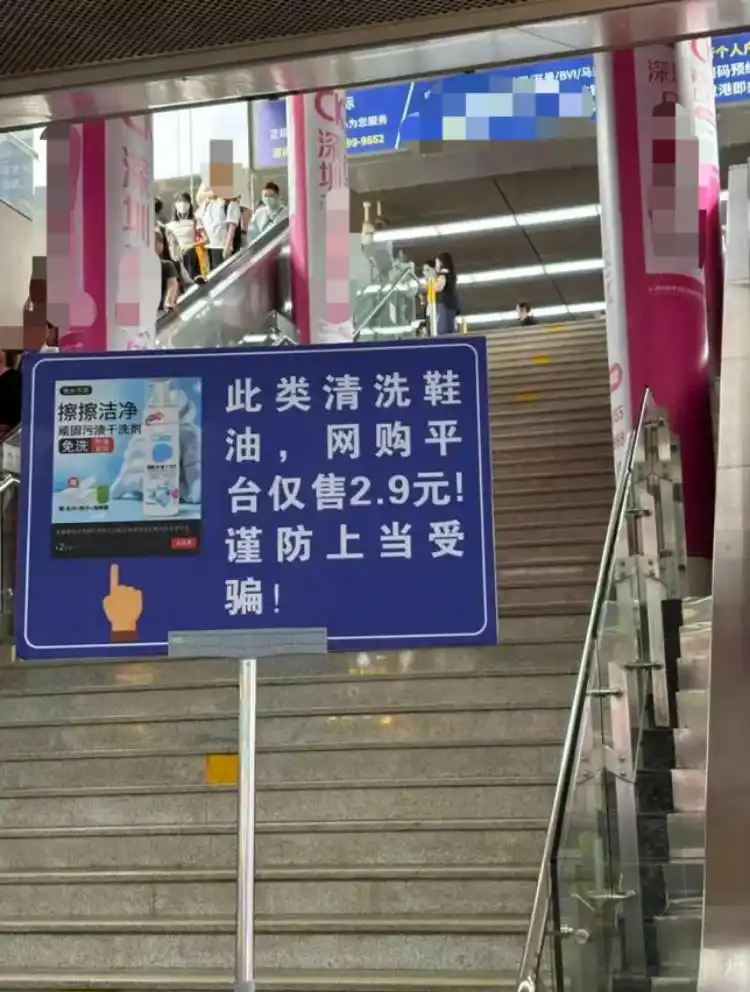 近日有网友发帖称,在深圳罗湖口岸与商业街衔接的自动扶梯处,看到多块蓝底白字的“防骗”警示牌,标注“此类清洗鞋油,网购平台仅售2.9元!谨防上当受骗!”该类警示牌在社交平台引发广泛关注和热议。