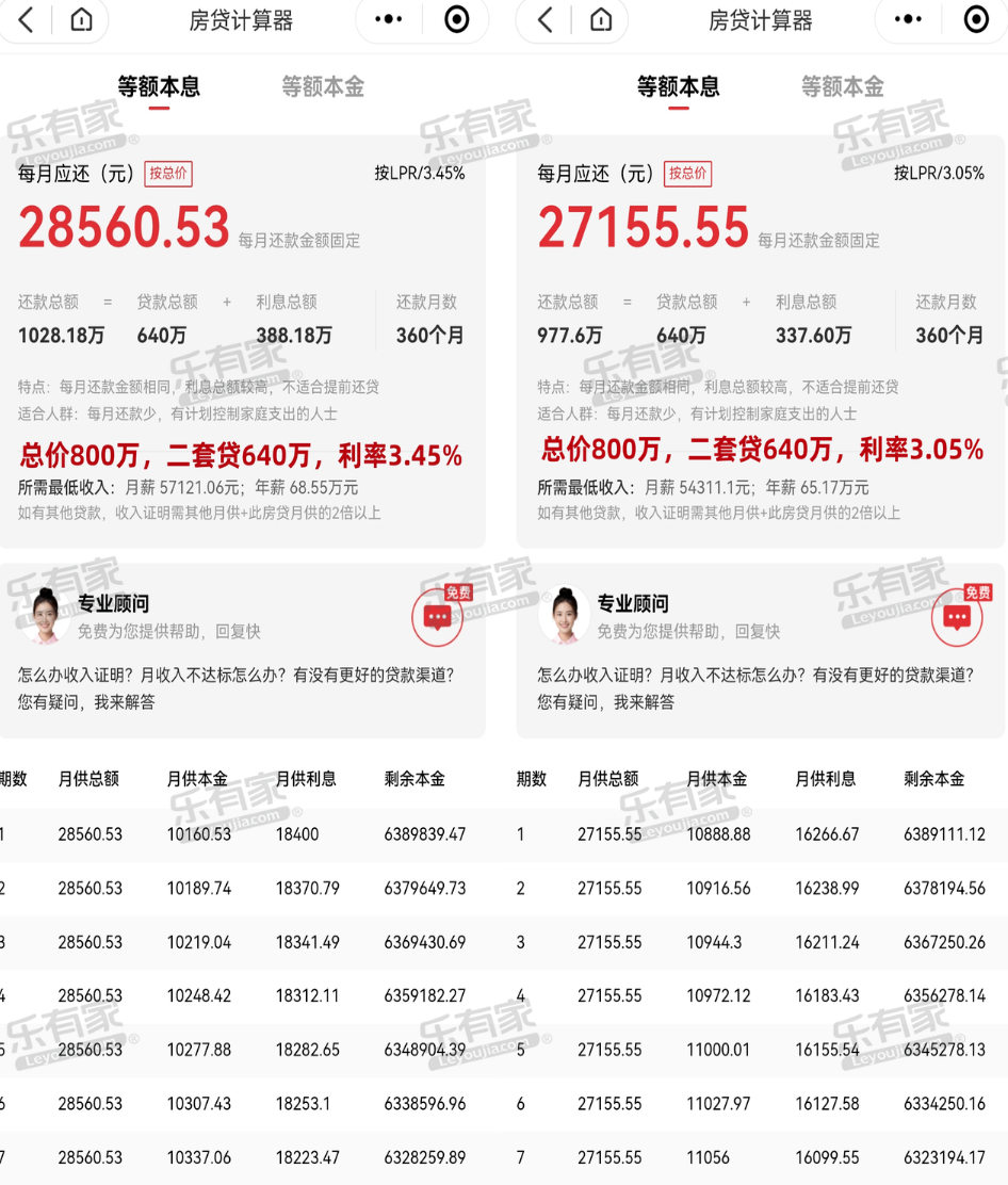 此前深圳首套房和二套房的利率定价公式分别为LPR-45BP和LPR-5BP。根据此次政策,二套房贷利率降低40个基点。按照深圳现行利率,则首套二套利率均为3.05%,此前二套利率3.45%,直接利好改善型需求。据深圳乐有家研究中心测算,购买二套,总价800万的房产,贷款30年,等额本息支付,利息可省51万元。