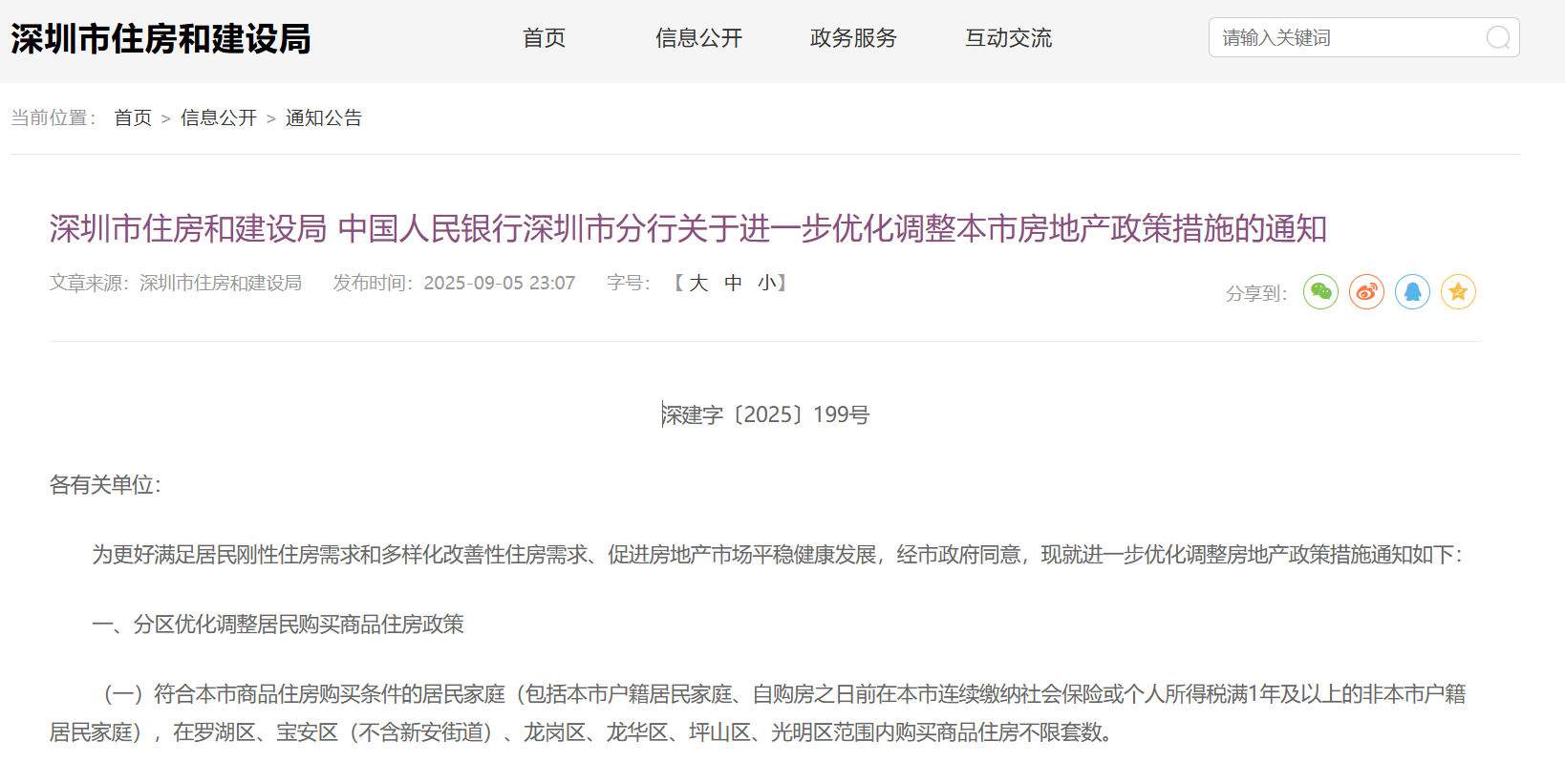 万众期待下,深圳楼市新政终于出台。9月5日晚间,深圳市住房和建设局、中国人民银行深圳市分行联合印发《关于进一步优化调整本市房地产政策措施的通知》。