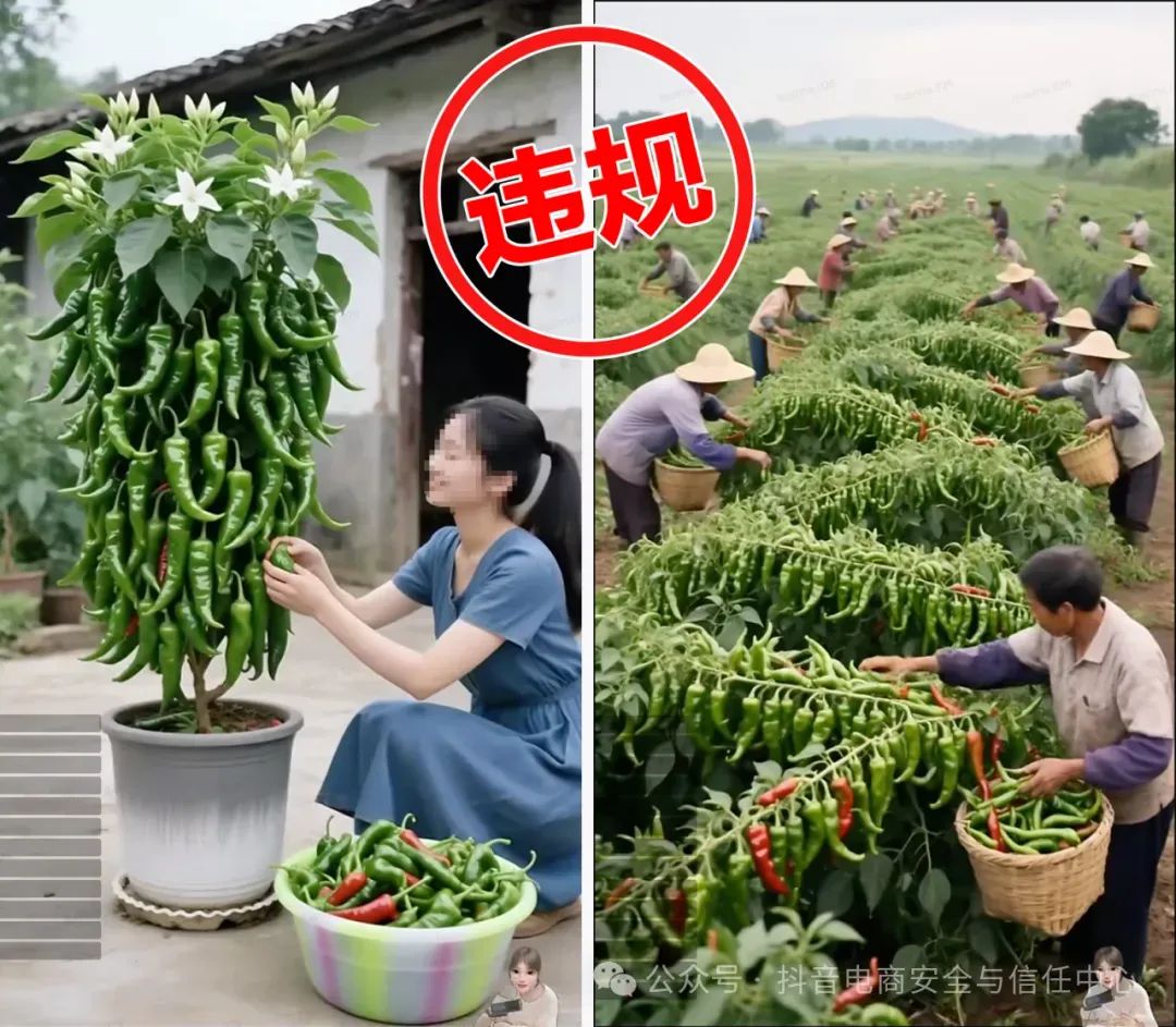 创作者利用AI创作不符合现实或不存在的商品内容,甚至夸大商品大小、量产等,涉嫌虚假宣传。如,少数创作者在直播间利用AI展示樟树港辣椒丰收的场景,辣椒的数量、分布和植株生长规律完全不符合现实农业,并在口播中夸大种苗的量产,误导消费者下单。